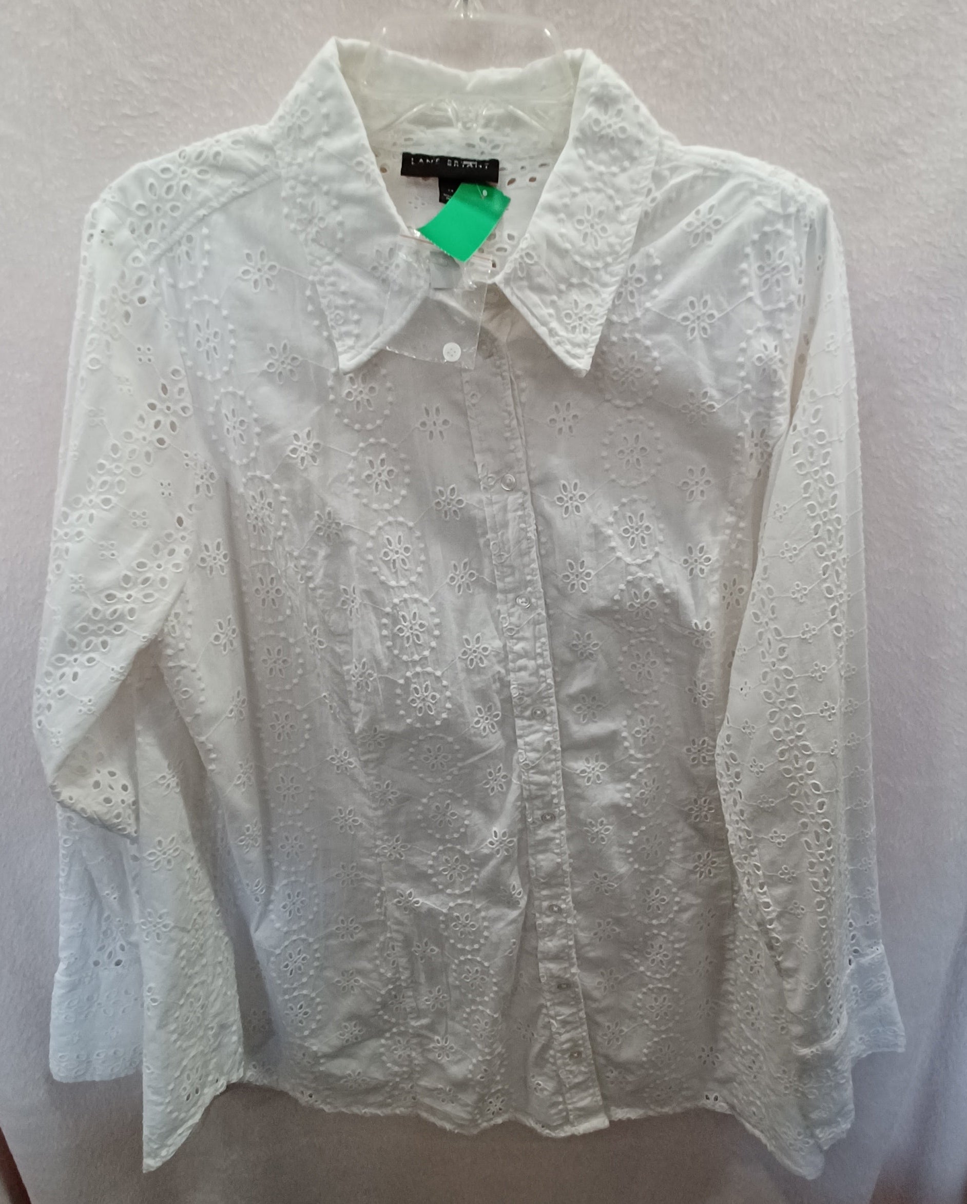 Long sleeve button up blouse in white with die cut print. Brand new without tags.