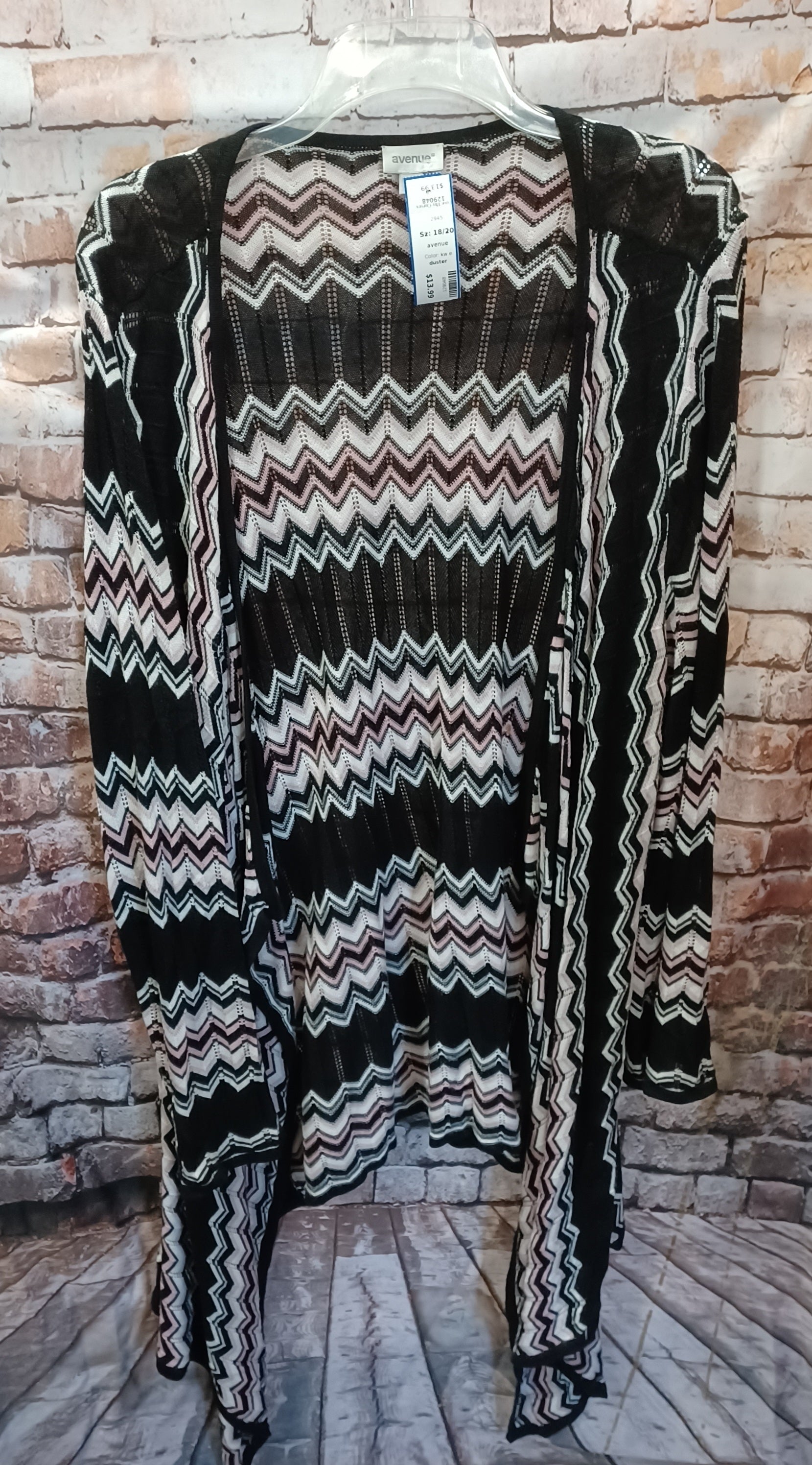 Long sleeve and light weight no close front duster. Medium length with longer panels in the front. Black pink and white pattern.