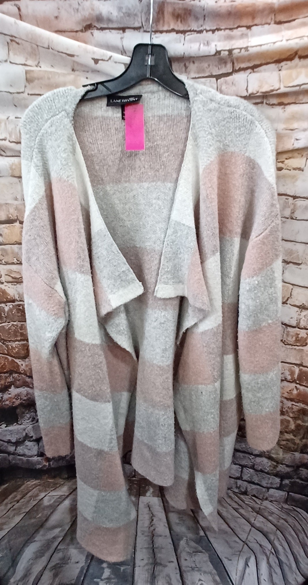 Love this long sleeve no close front medium length duster in grey white and soft pinks.