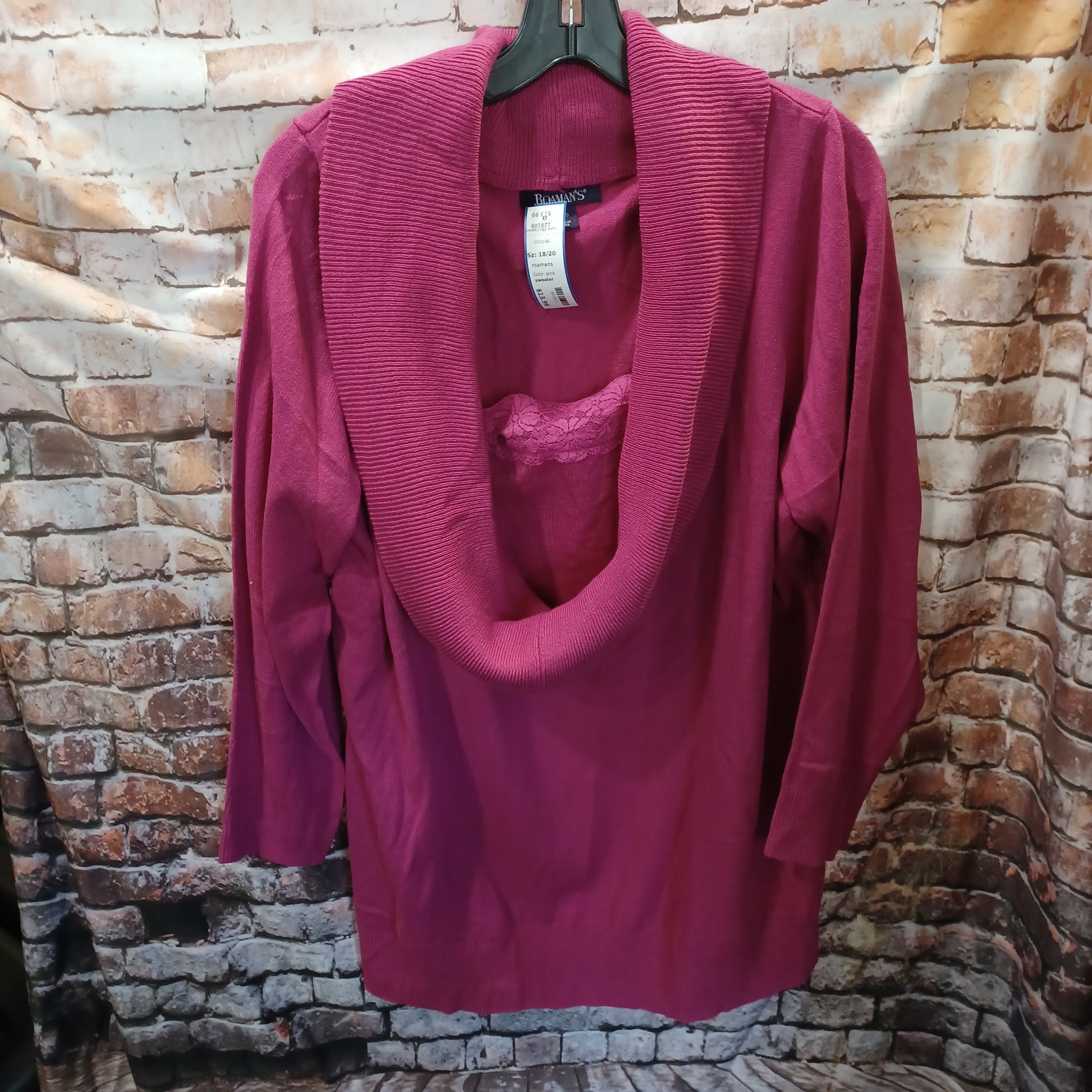 Long sleeve pink sweater with deep cowl neck collar and sewn in modesty panel