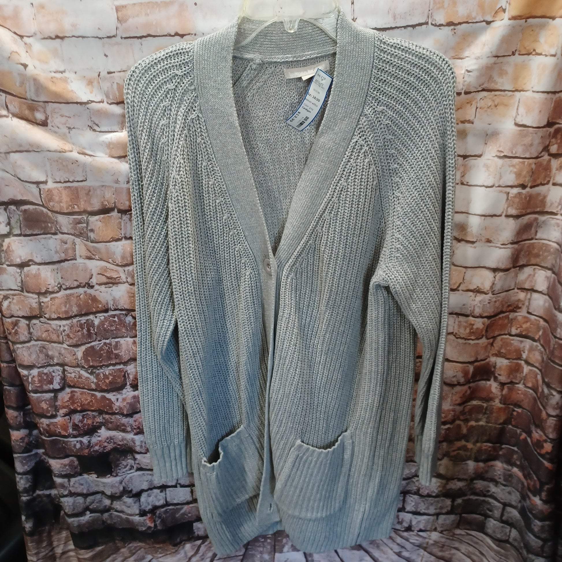 Longer cardigan in grey with button front and long sleeves. Will go below the hips depending on height.