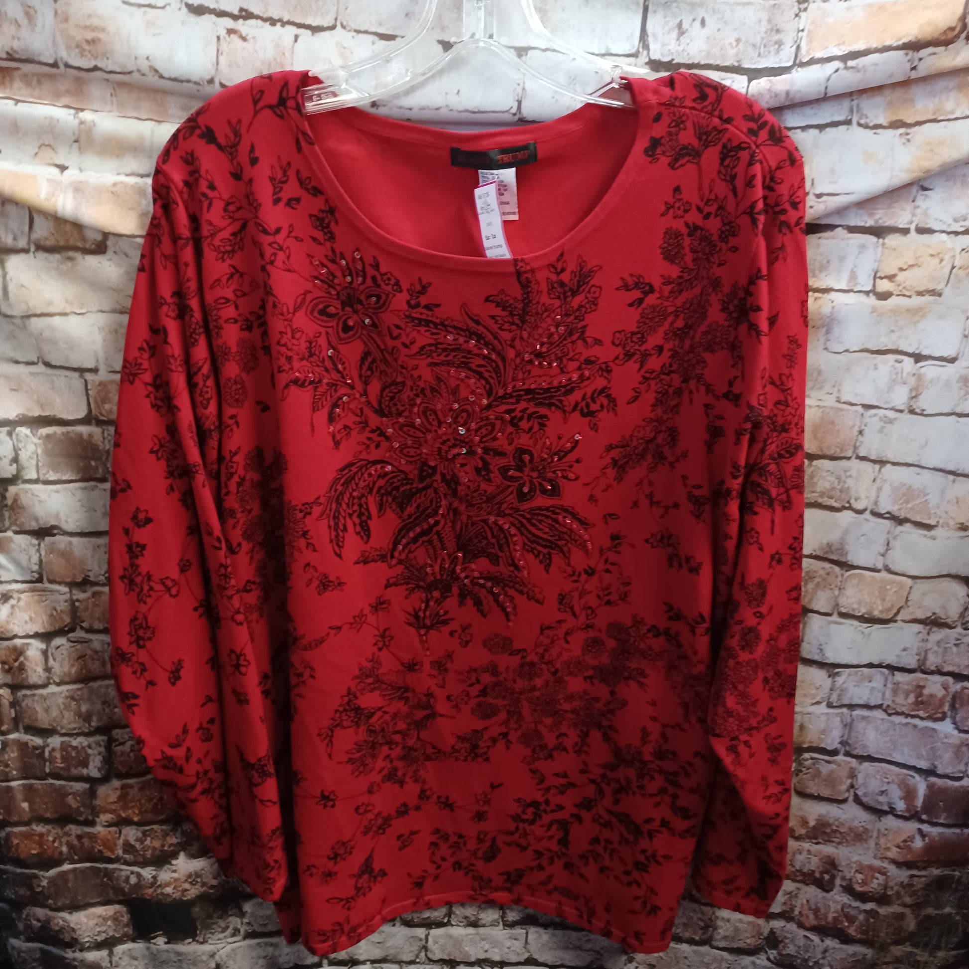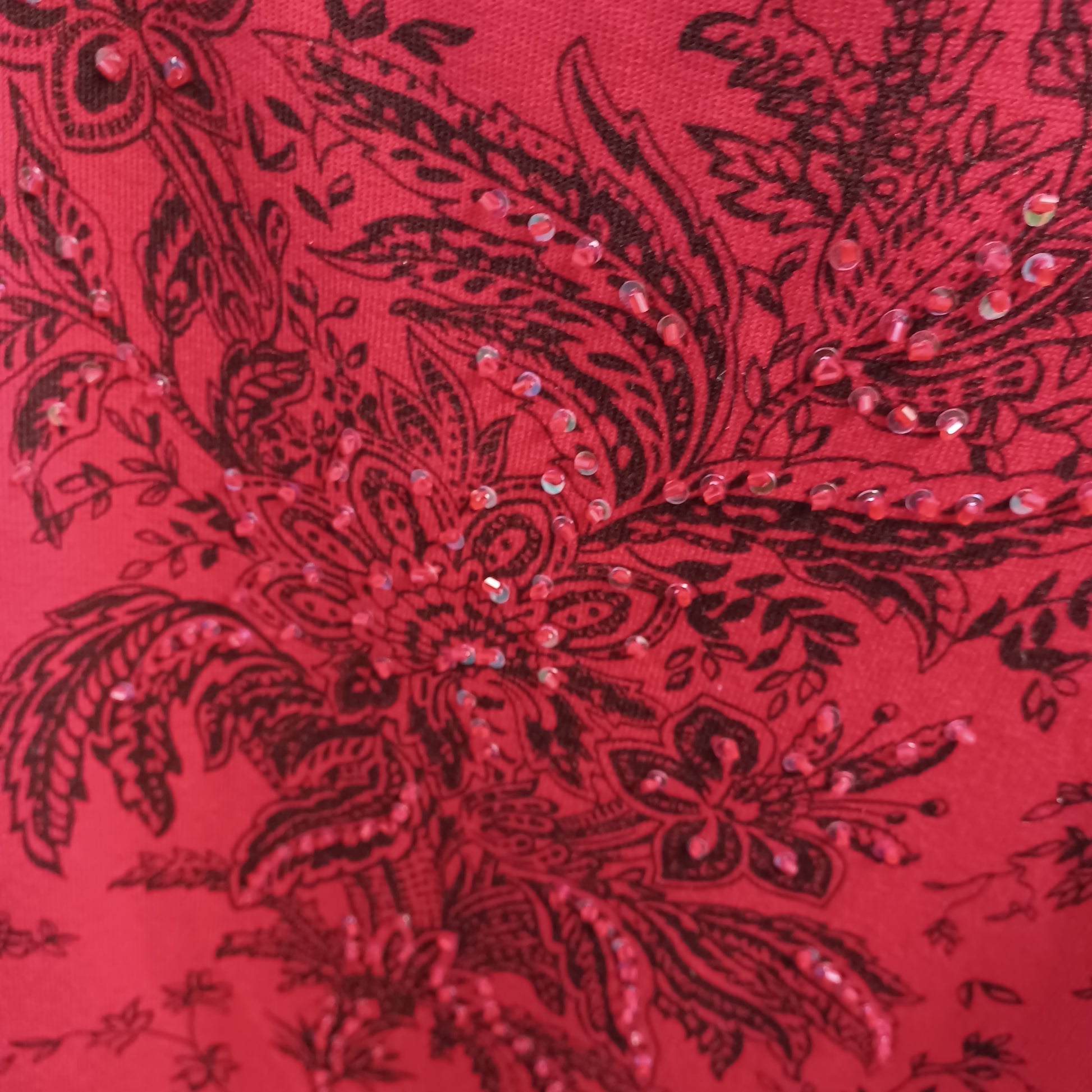 Long sleeve light weight sweater red and black printed with beadwork on the front.