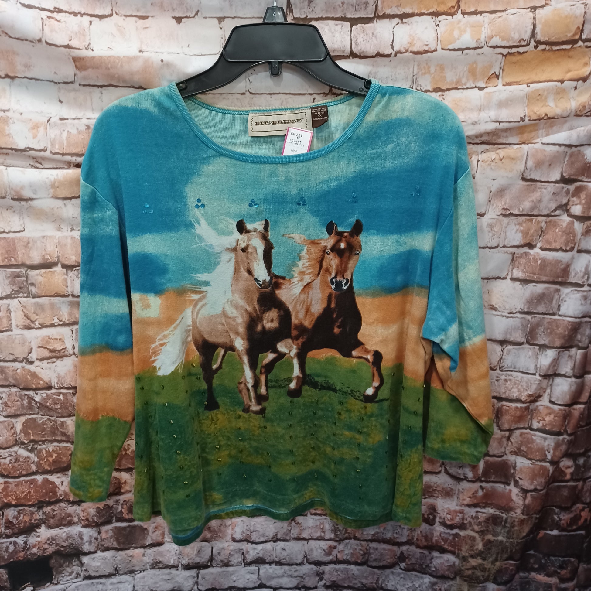 Half sleeve knit top with horse design and some bling. Back also has the same graphic without the bling. this is sewn into the knit design not a press on or stitched on graphic.