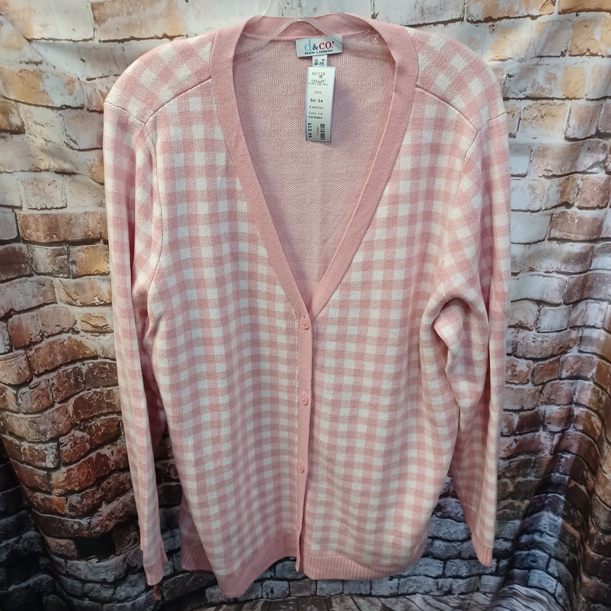 Long sleeve cardigan sweater with half button up in a white and pink patterned knit. Can be worn fall through spring.