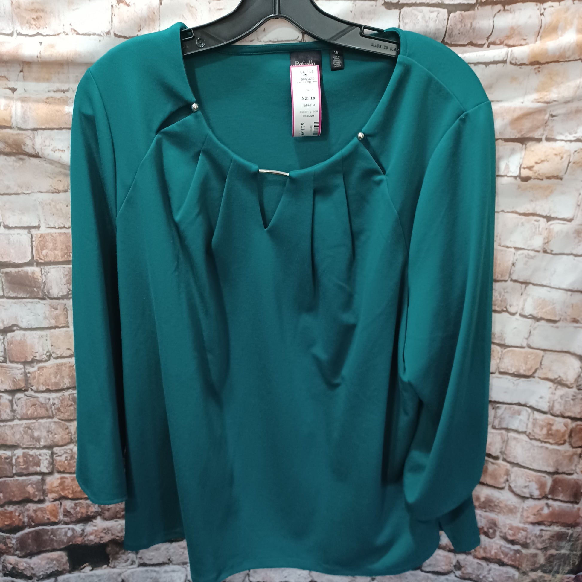 Three quarter sleeve blouse in teal green with metallic adornments on the neckline.