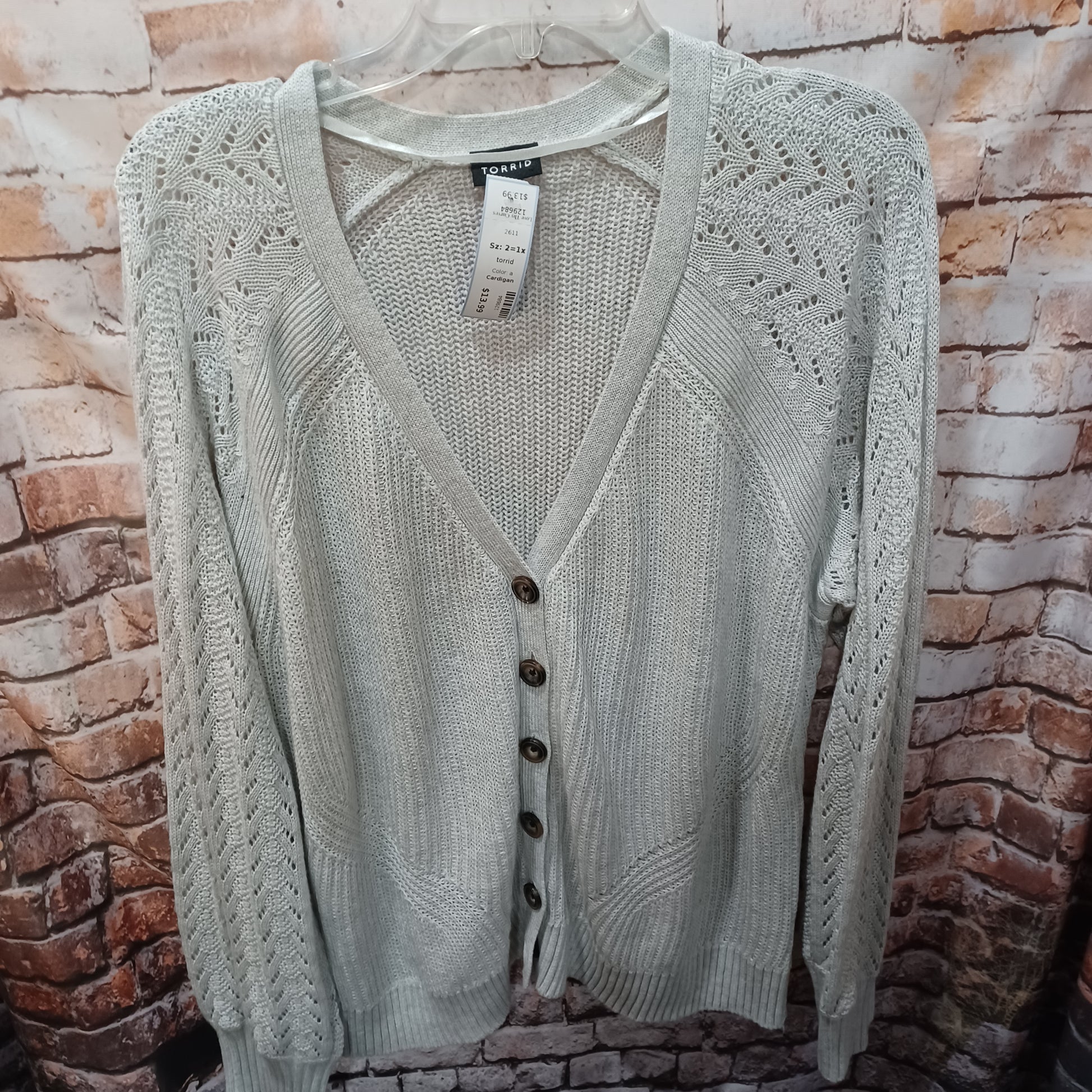 Long sleeve cardigan sweater in a light grey with half front button up. Fits a size 18/20.