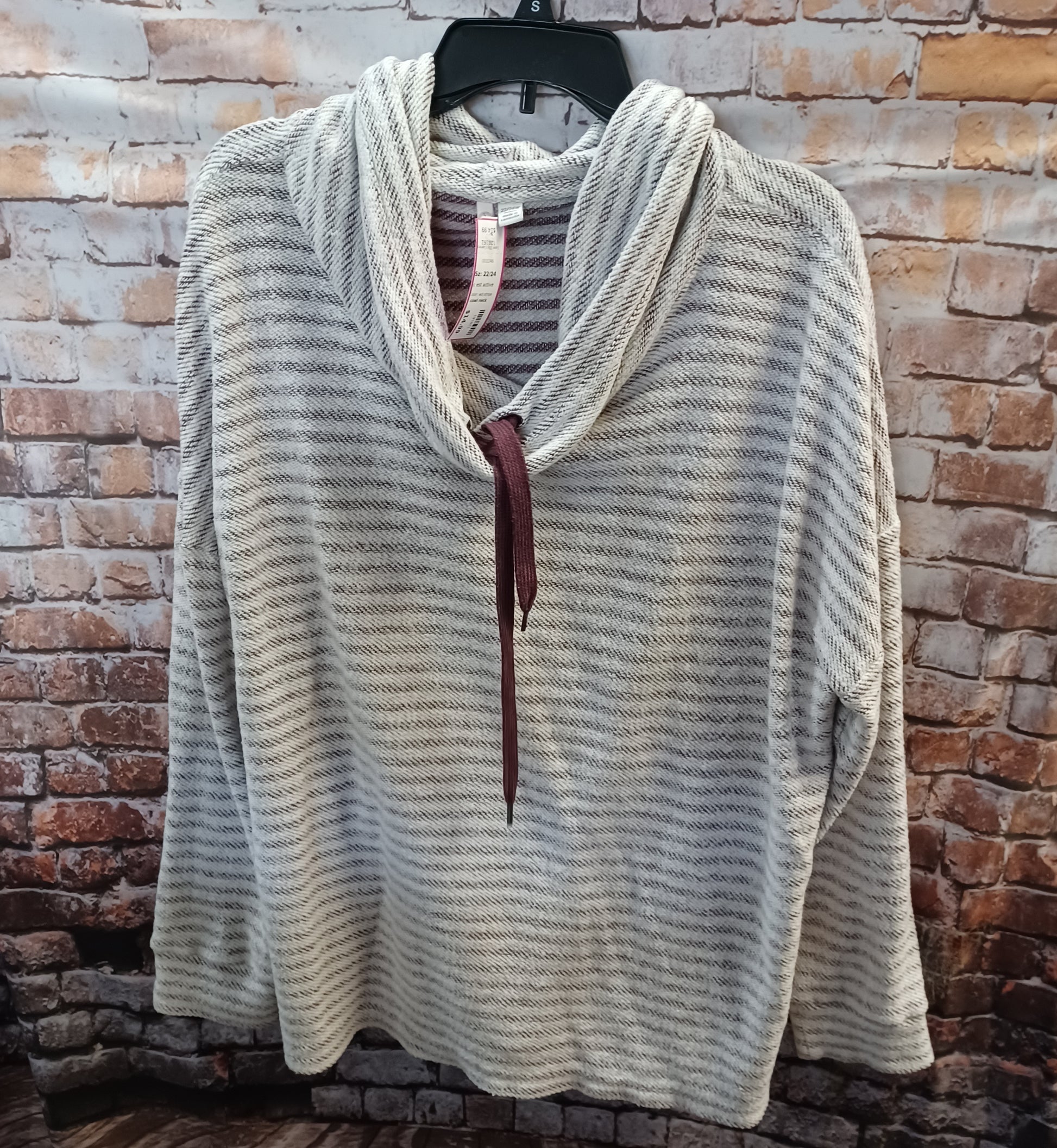 Long sleeve white and burgundy stripe top with a cowl neck collar. Perfect for those Boardman Football games. - Go Spartans!
