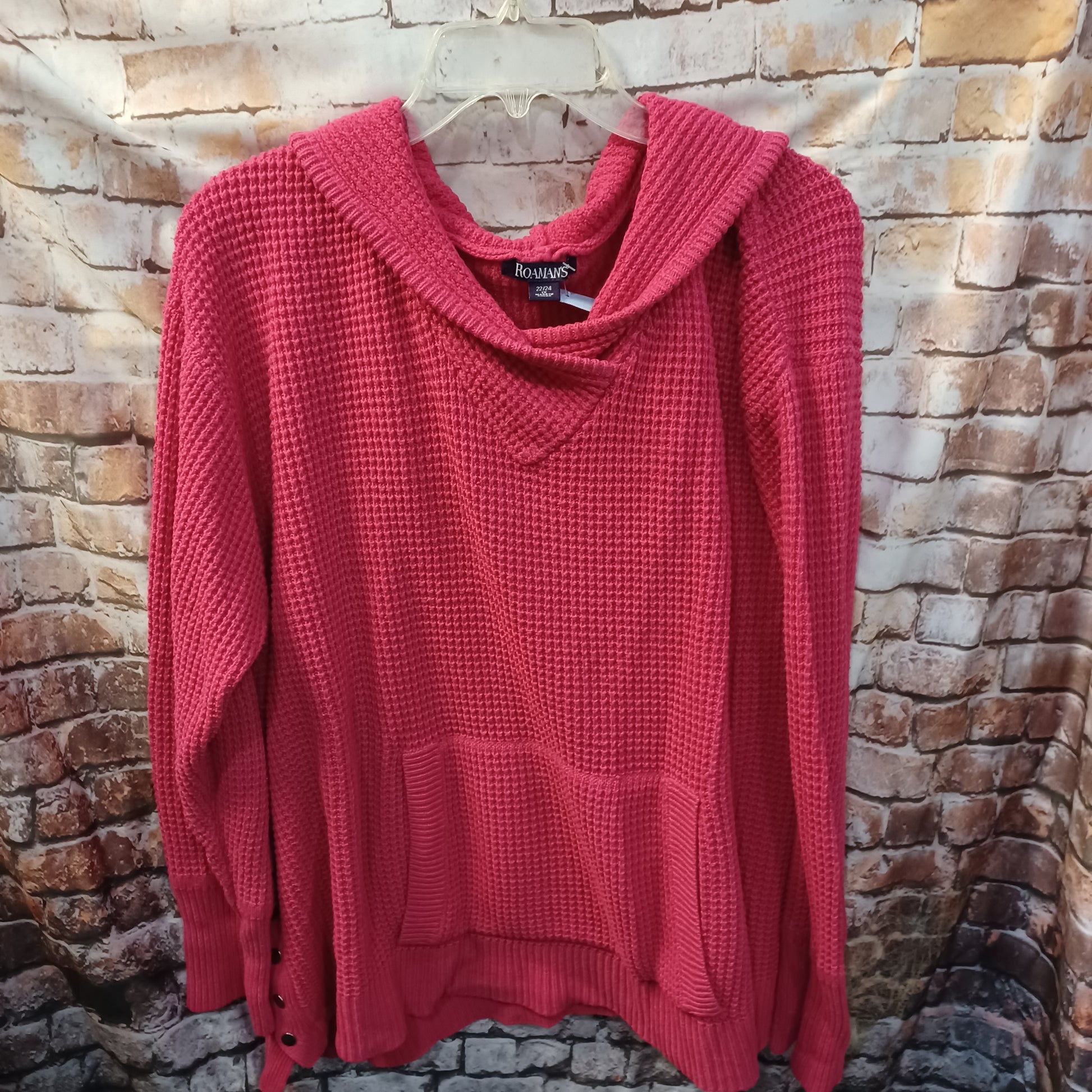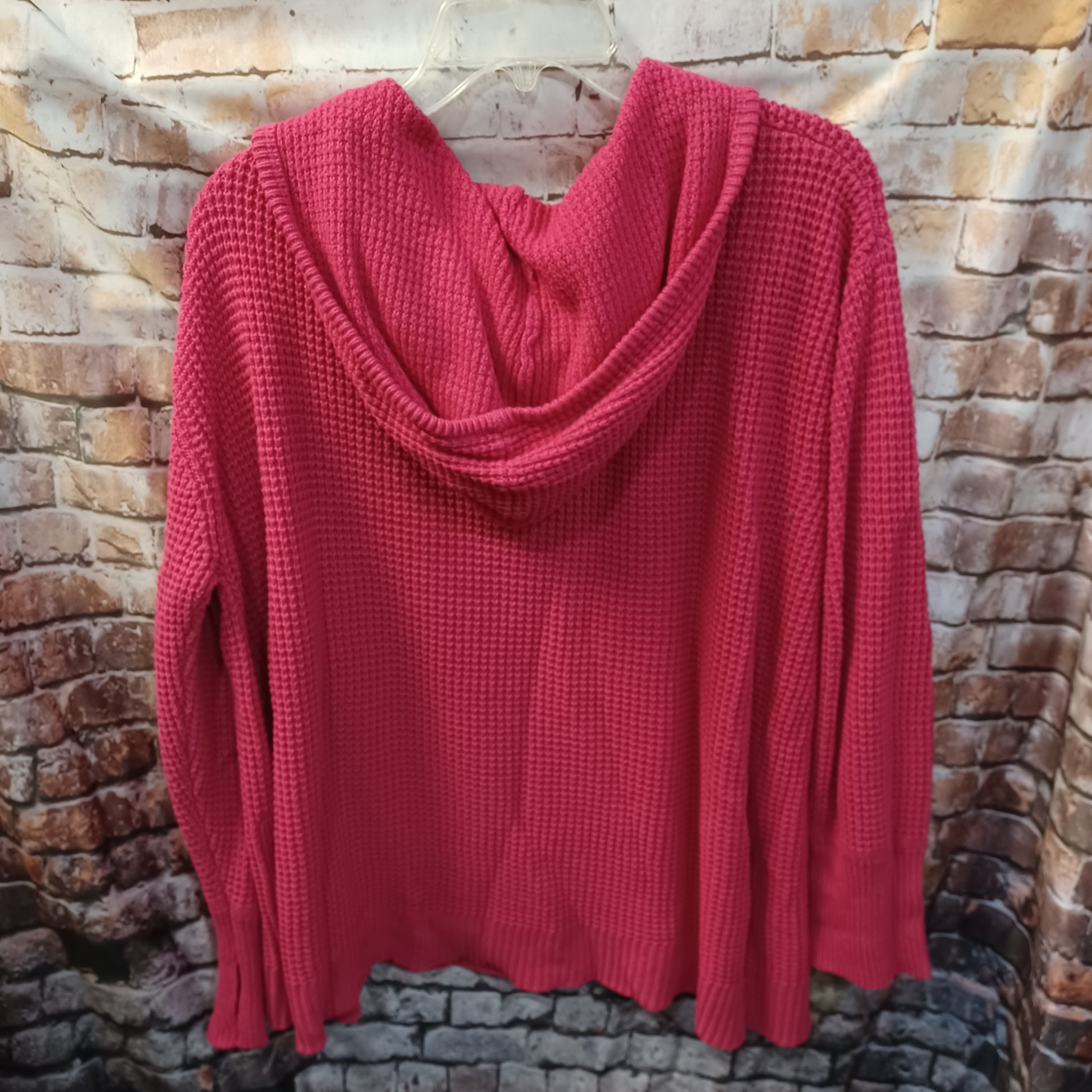 Long sleeve hoodie in a magenta sweater knit. Kangaroo pocket on front.