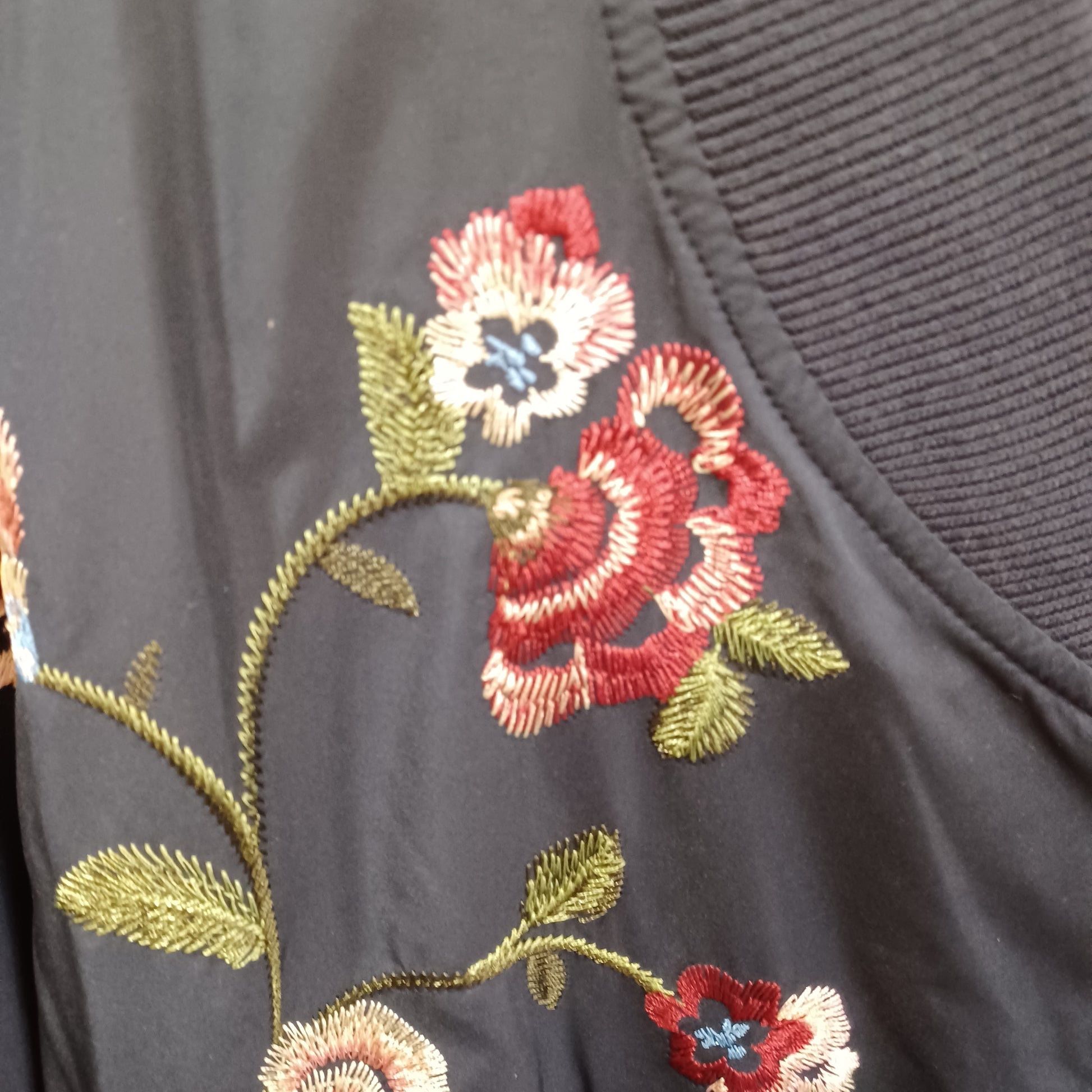Long sleeve jacket that is done in navy with embroidered floral design. Can be worn over your favorite cami or as a cute jacket in the fall.