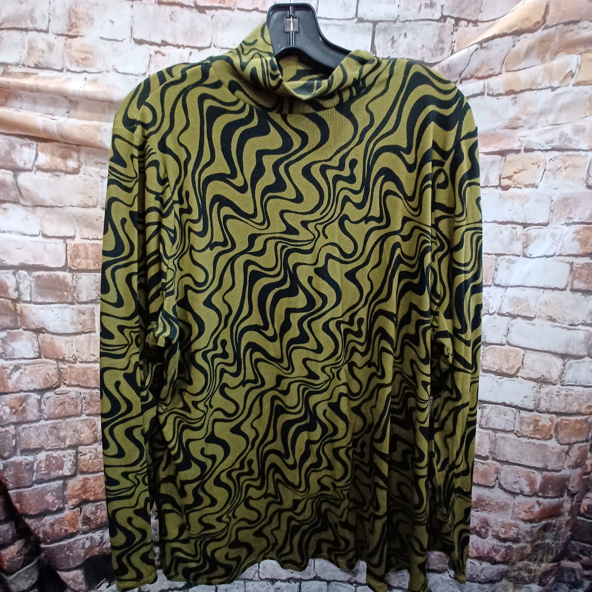 Cute long sleeve blouse with a turtleneck collar. Done in green and black print. It is great from August through December!