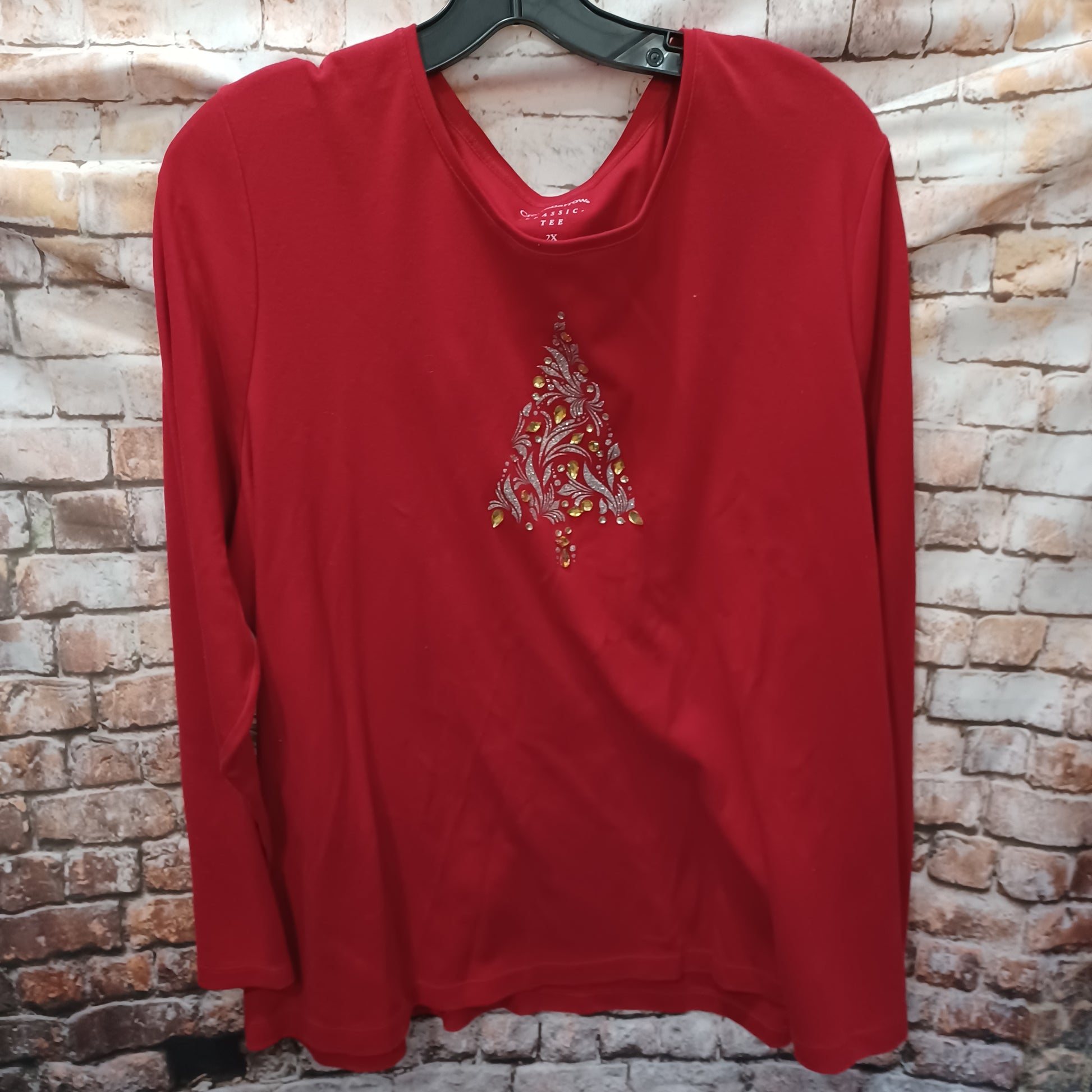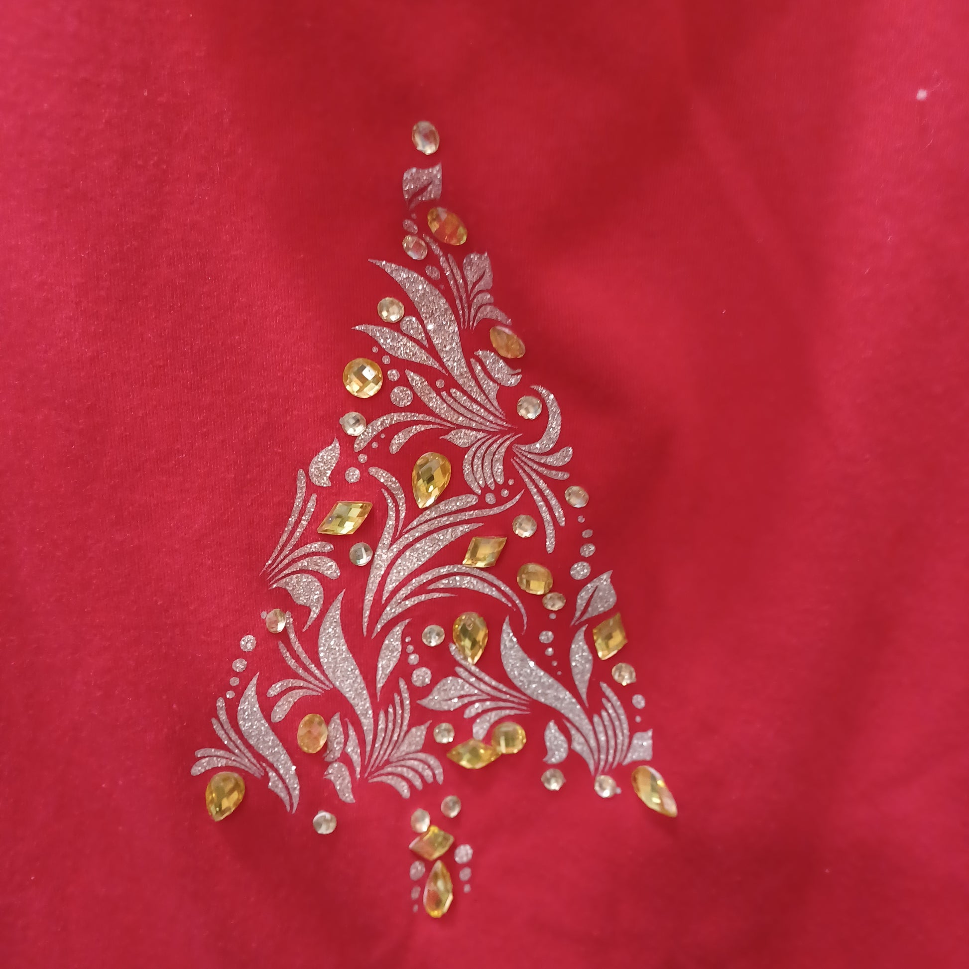 Long sleeve knit top in red with silver and gold beaded Christmas design.