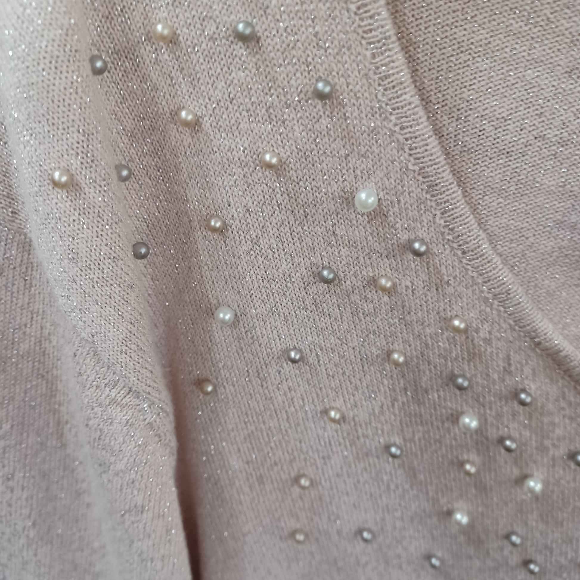 Long sleeve sweater in pink with silver metallic threading and pearls adorning the front.