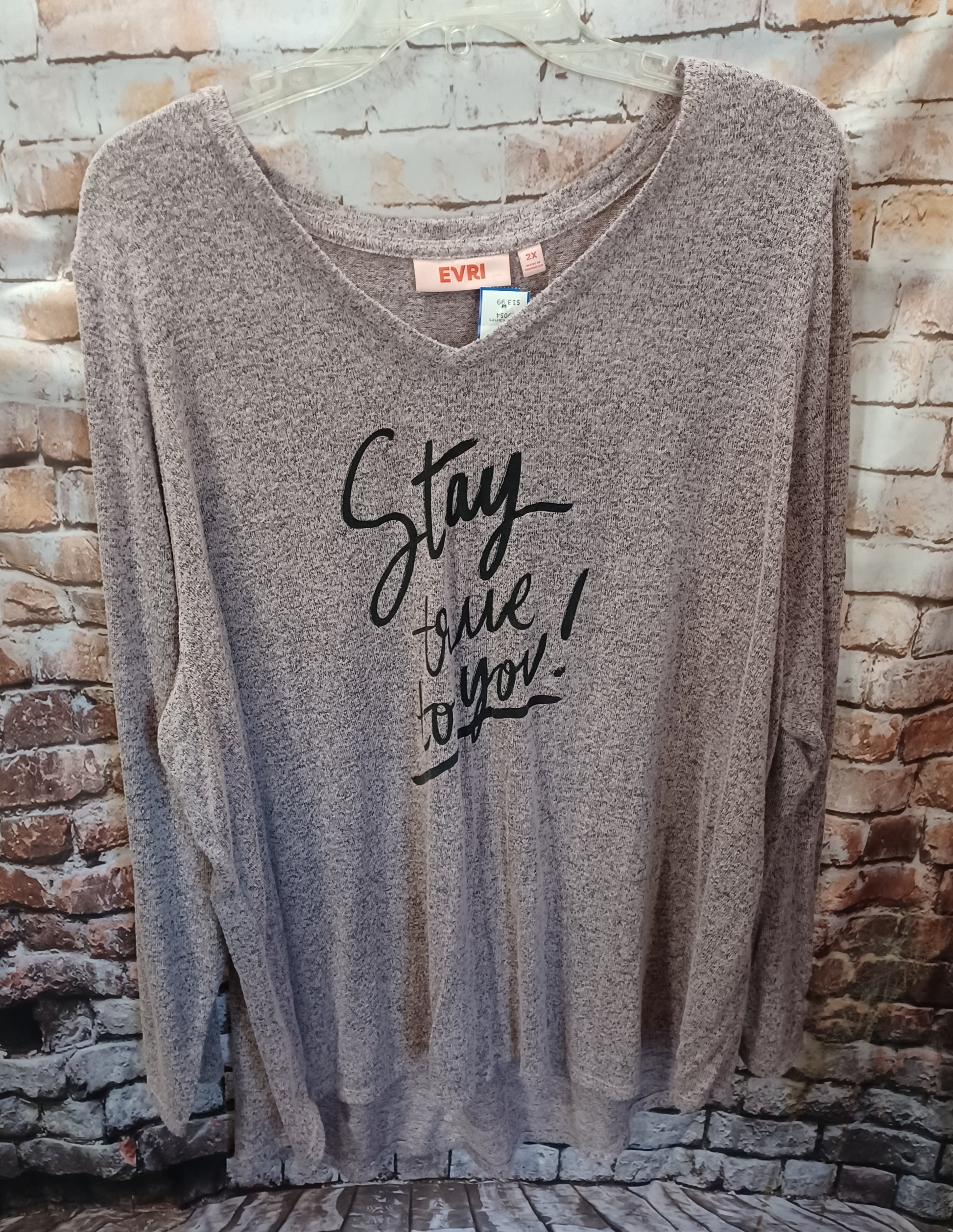 Long sleeve super light weight sweater in black and pink mesh knit and "Stay true to you!" graphic on the front.