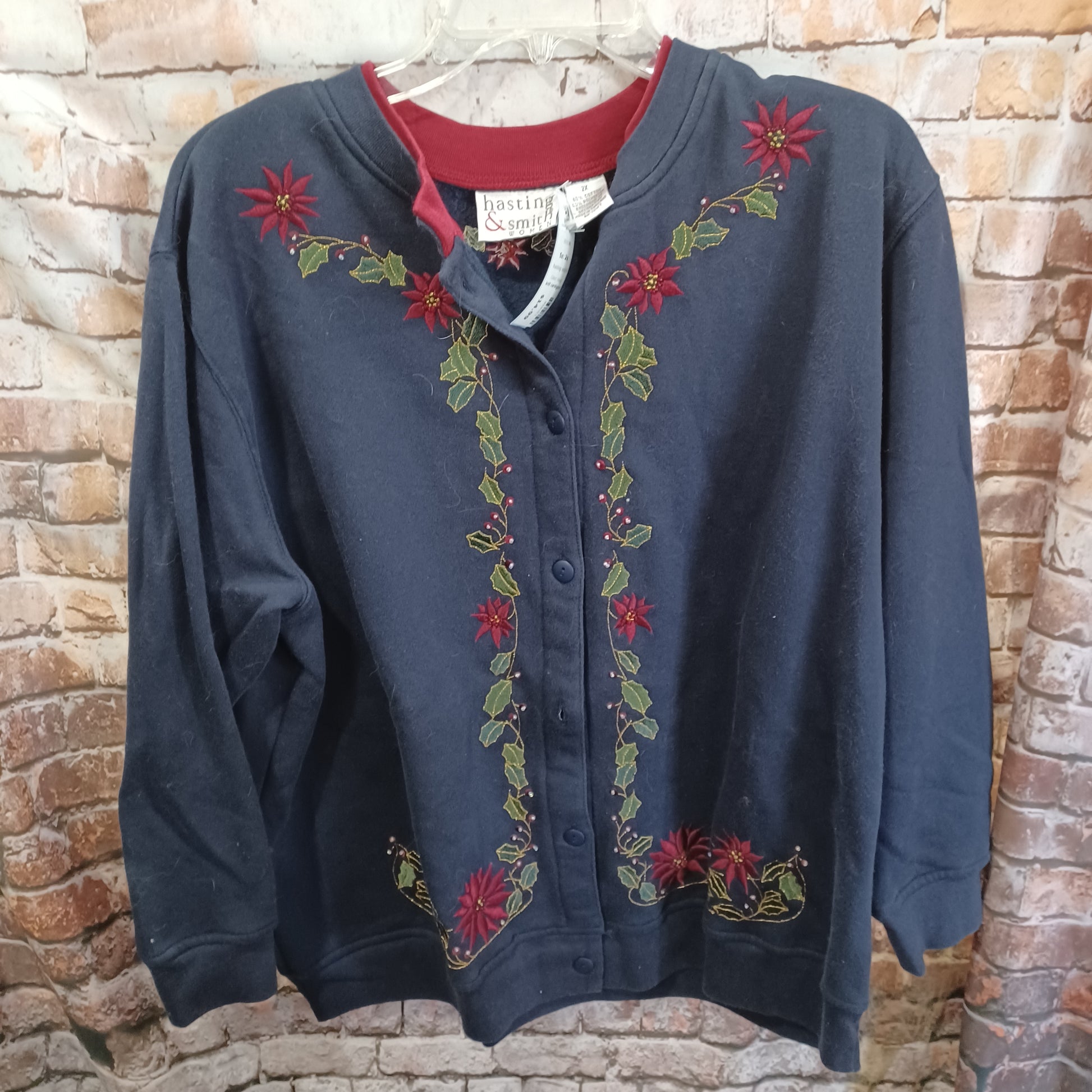 Knit button up cardigan style top in navy with poinsettia style ivy on the front embroidered.