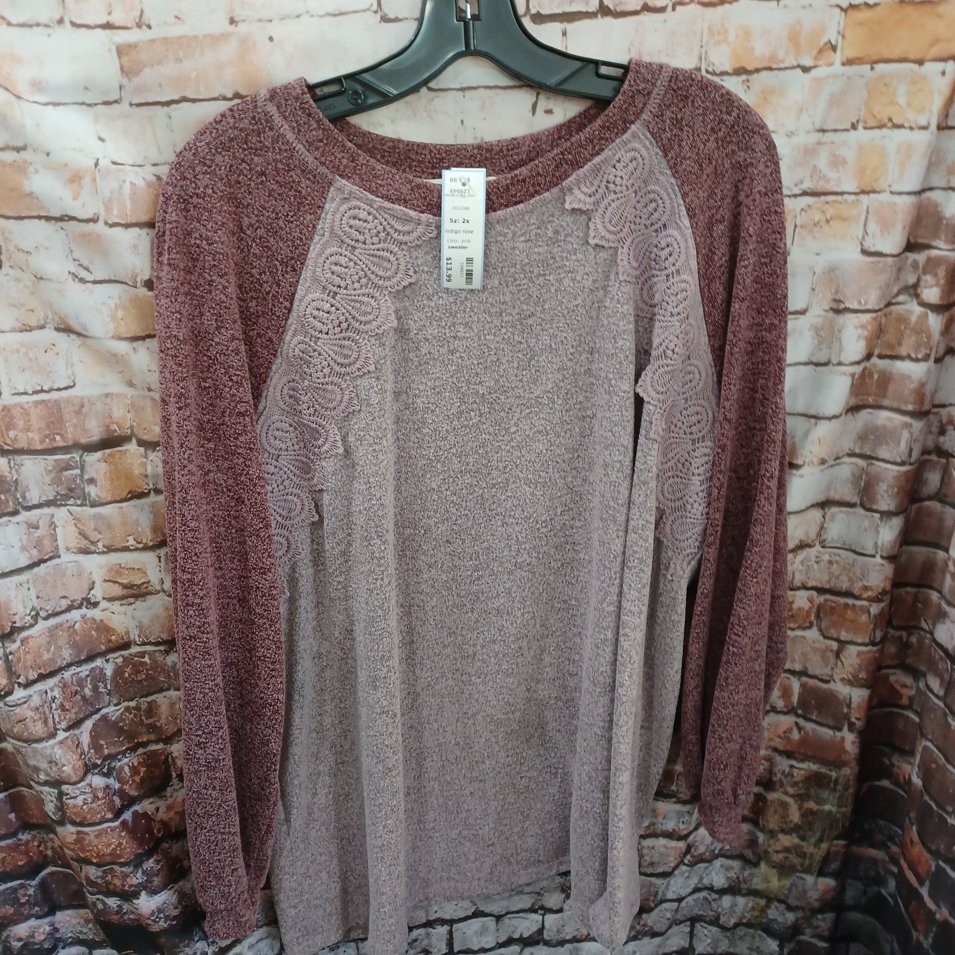 Long sleeve light weight sweater in pink and mauve with lace on the inseam of the shoulder on the chest.