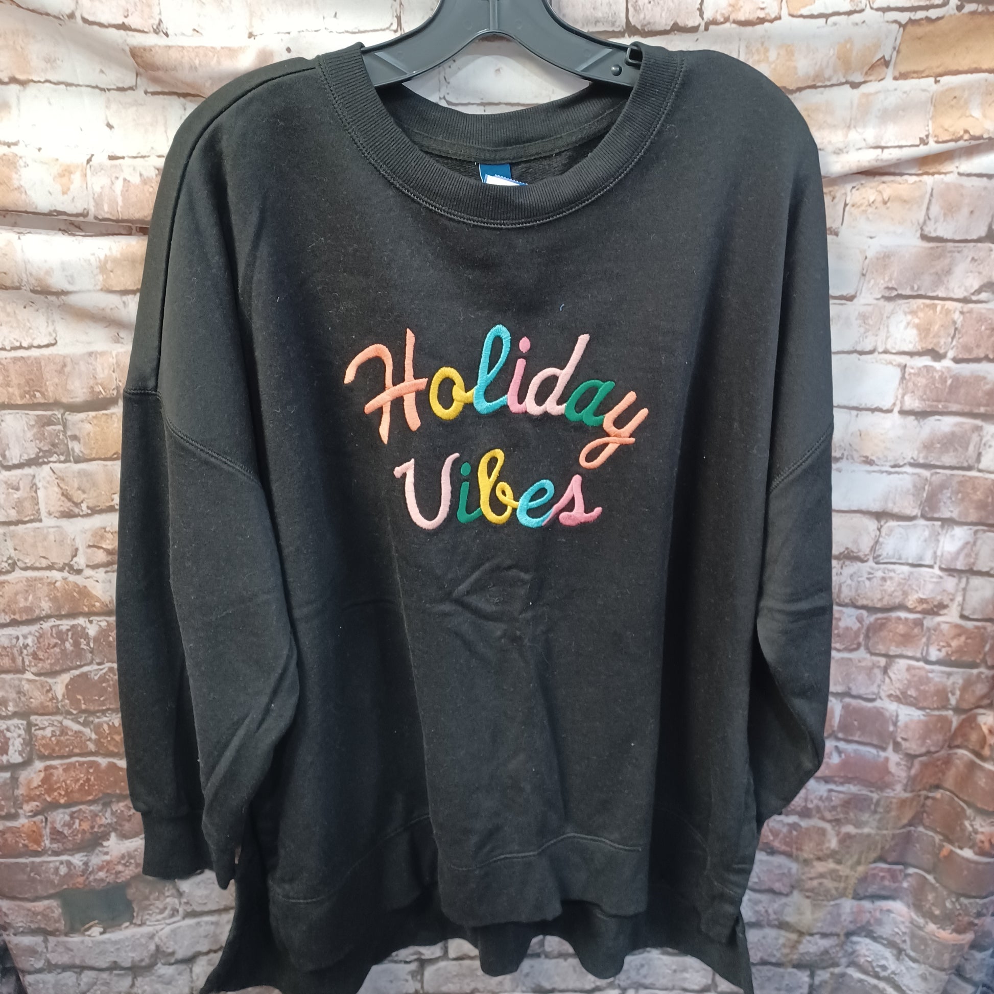 Long sleeve black sweatshirt with embroidered holiday vibes on the front.