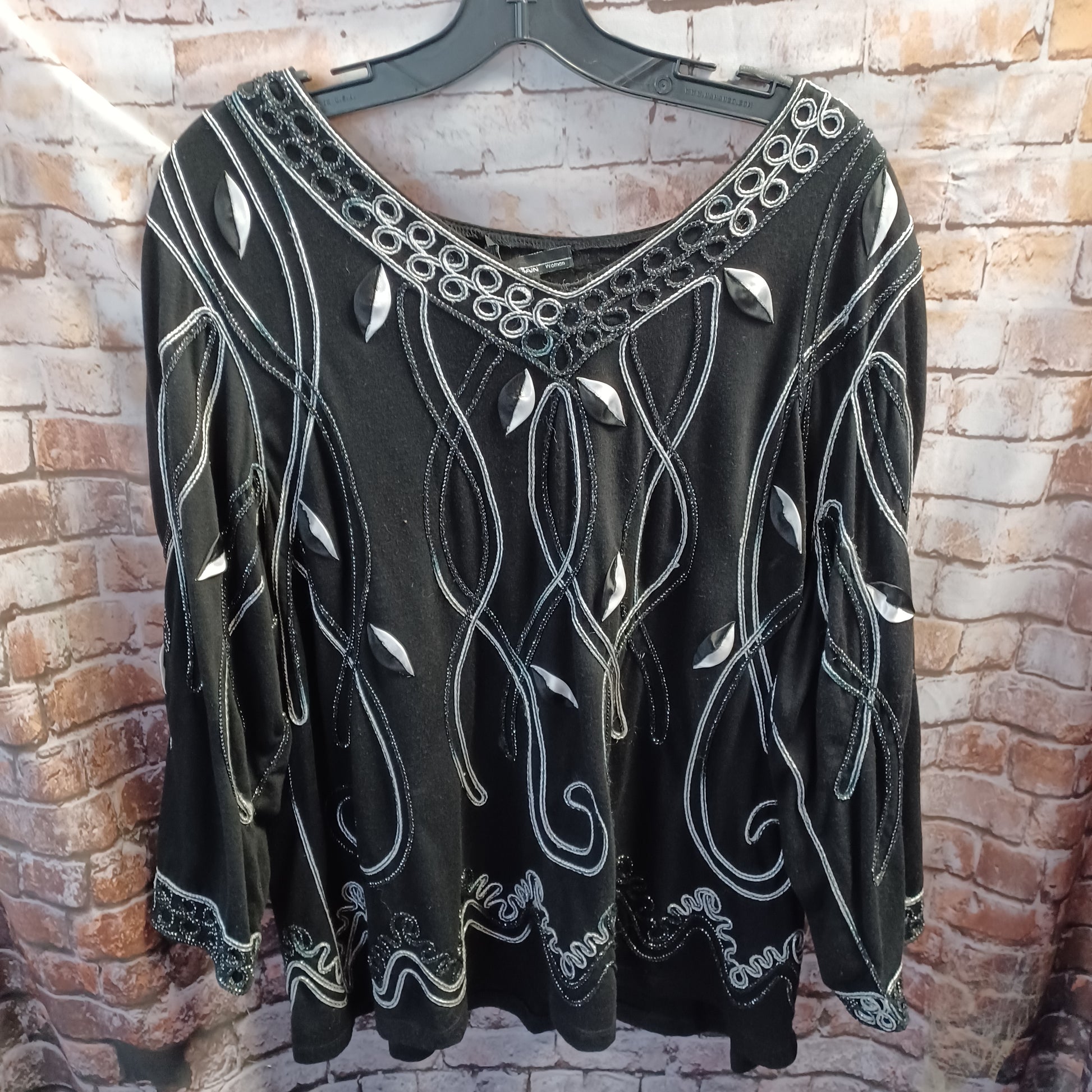 Beautiful embellished black blouse. Black silver and white embroidered design.