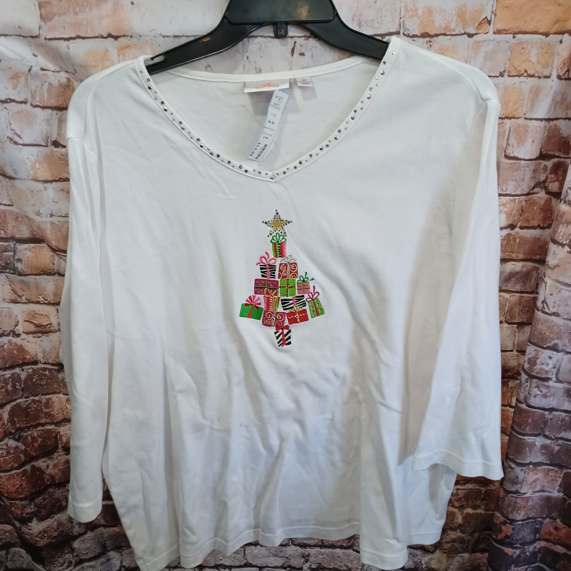 Three quarter sleeve white tee with v neck collar and a cute present tree embroidered on the front.