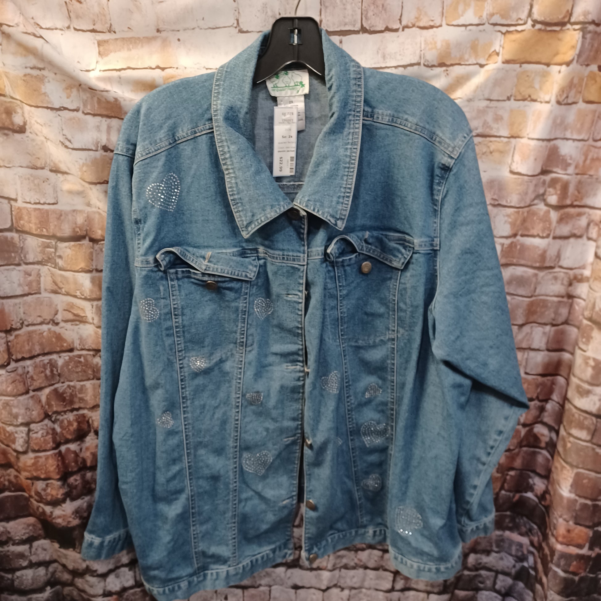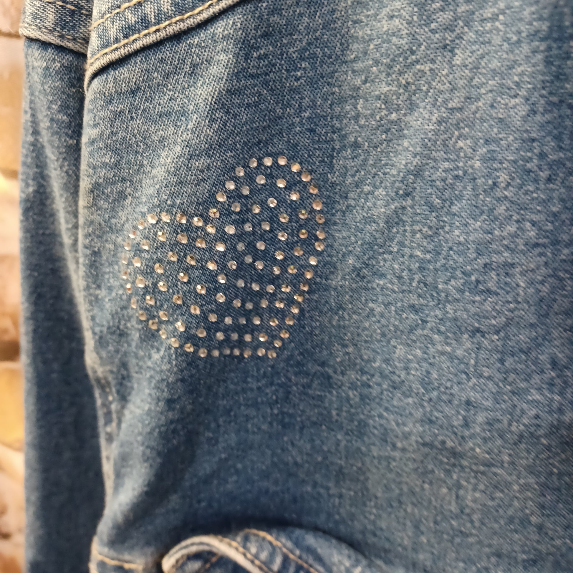 Long sleeve button up front denim jacket with cute bling hearts on the front and back shoulder,