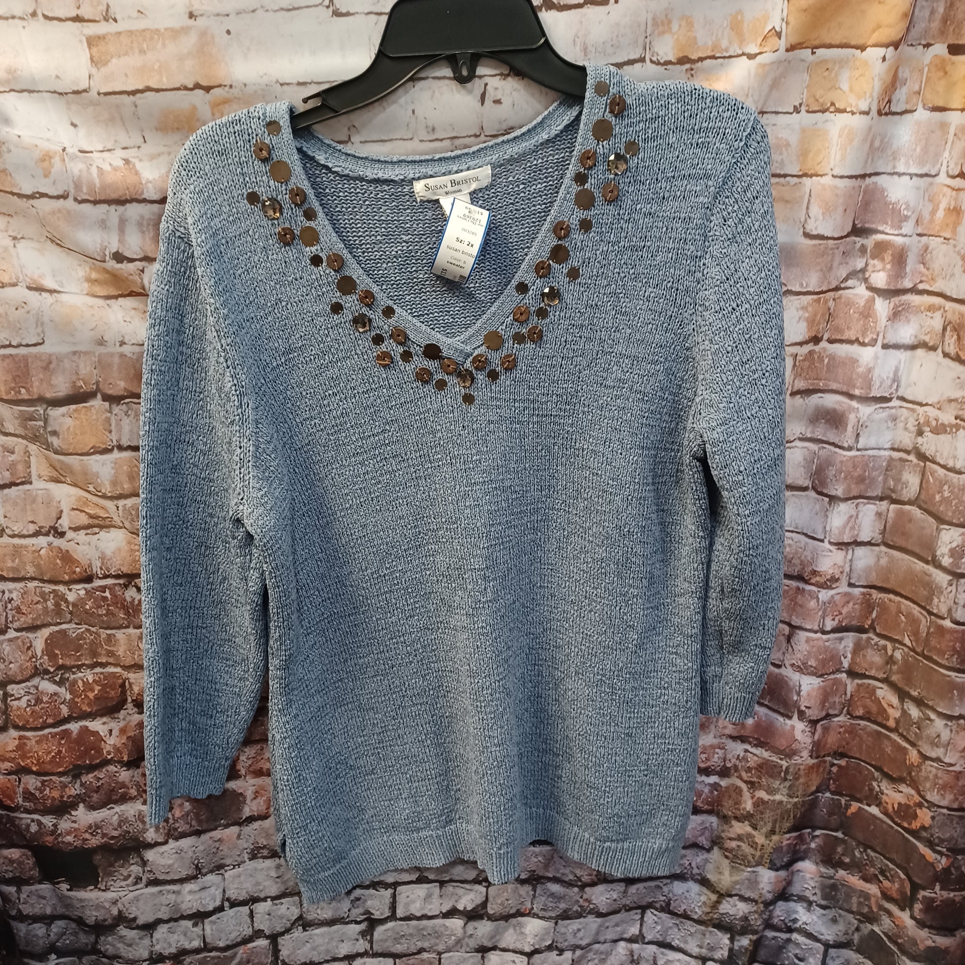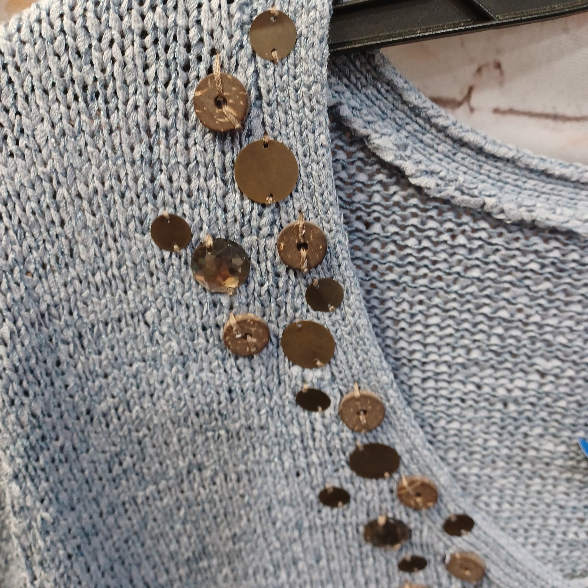 Love this three quarter sleeve sweater in blue with adornments on the neckline in browns