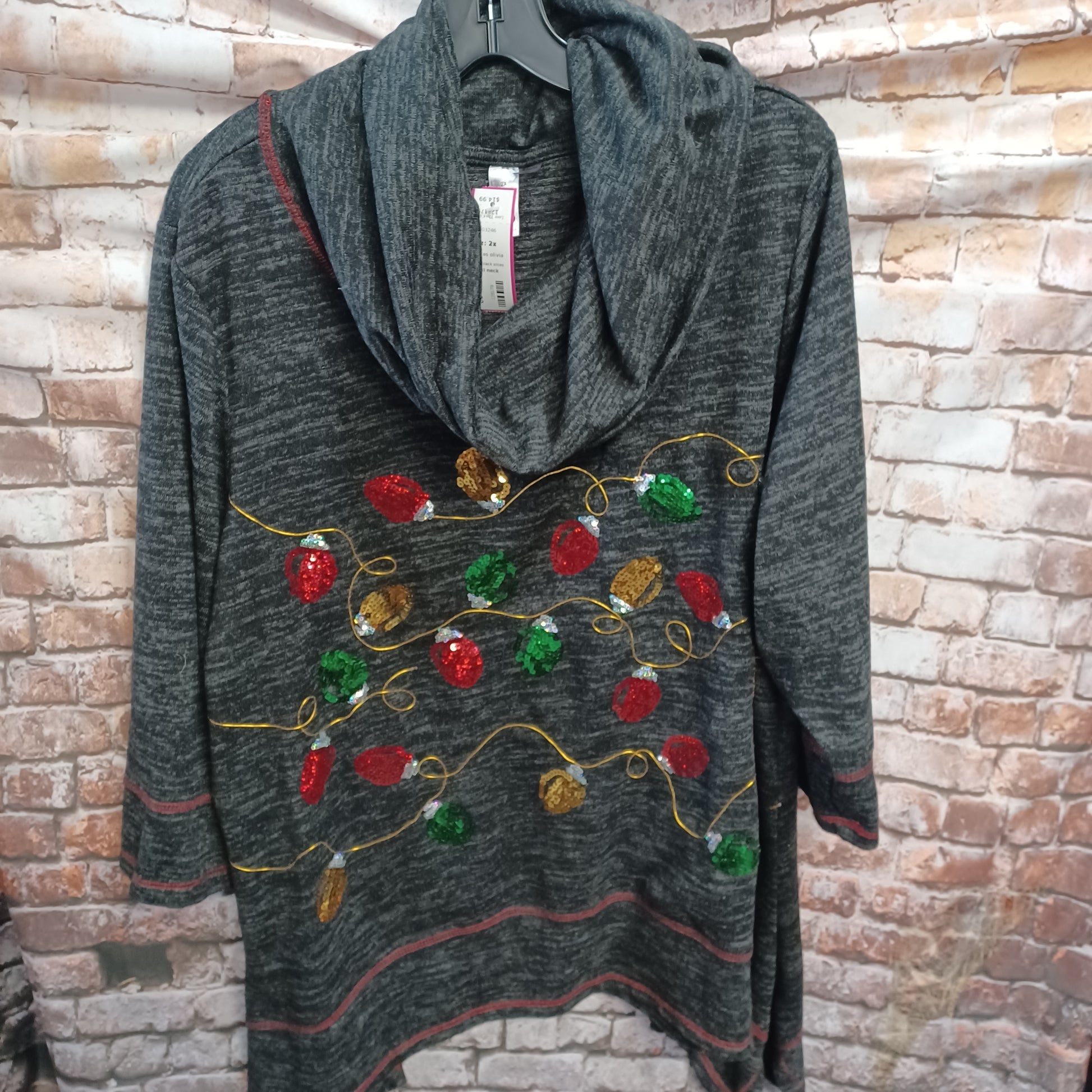 Half sleeve fleece cowl neck top in grey and charcoal. Sequined embroidered holiday lights on the front.
