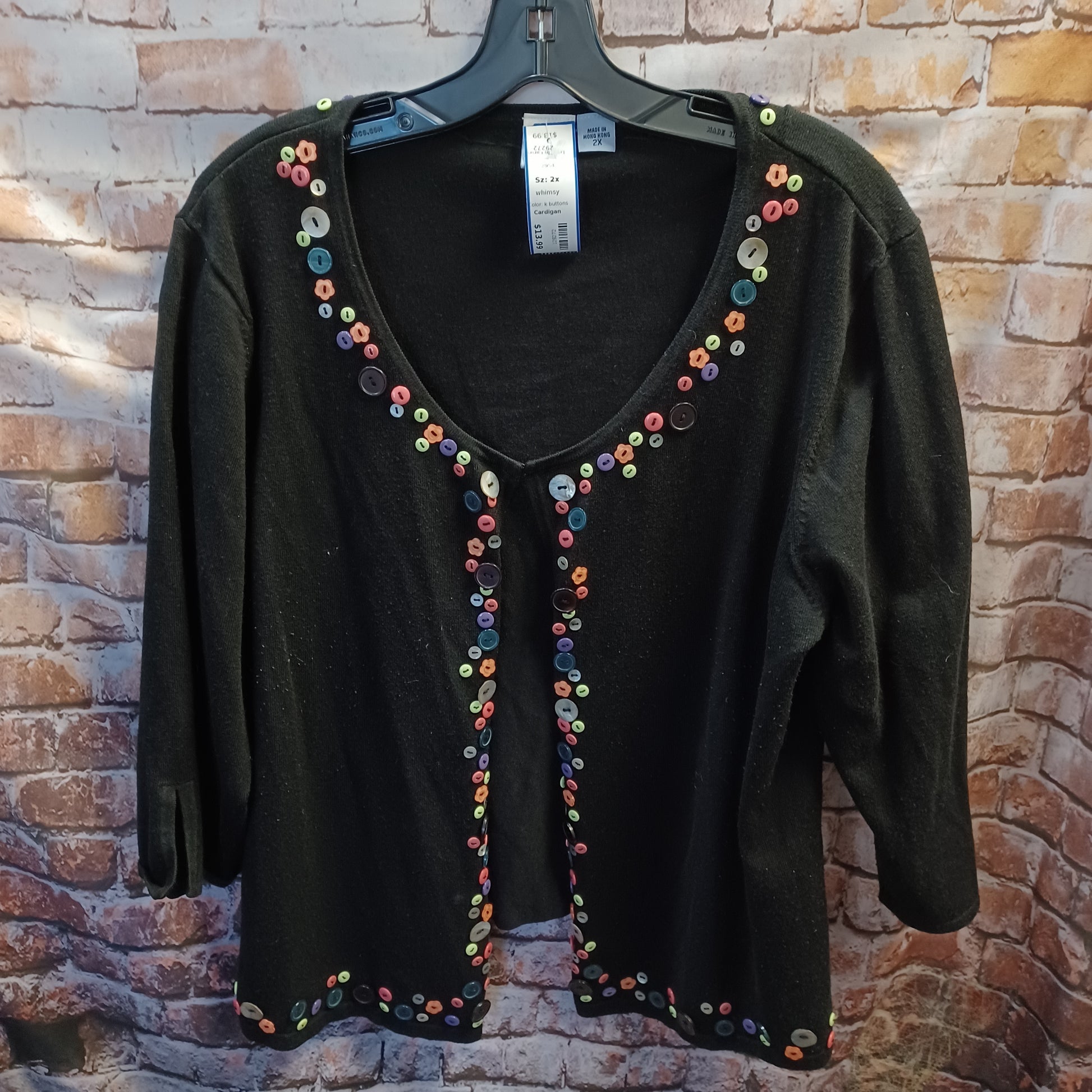 Cuteness overload with this cardigan in black with long sleeve and a hook/eye closure at the neck. Adorned with multi colored buttons on the collar, hem and down the front.