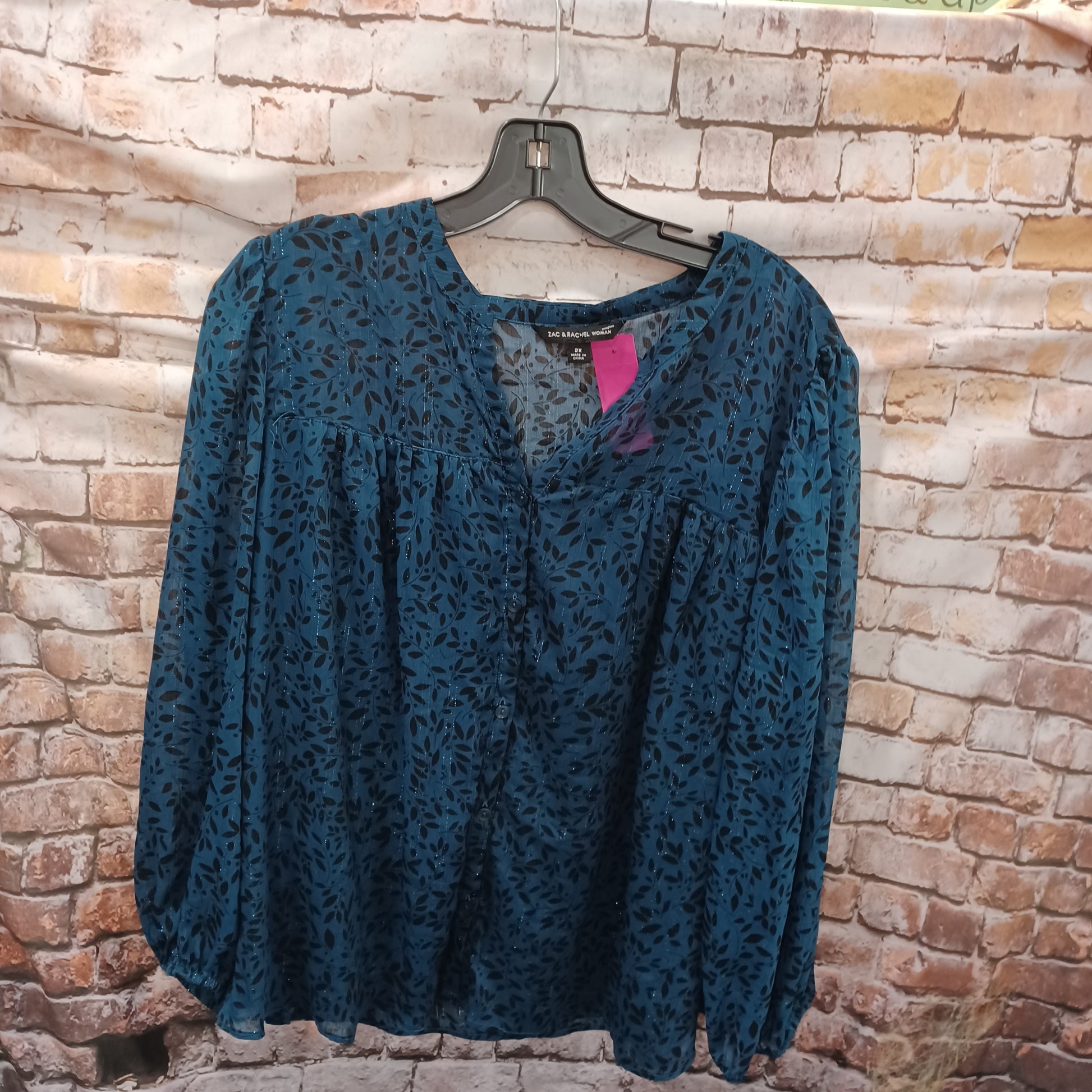 Such a pretty teal blouse with black floral print and metallic silver threading.
