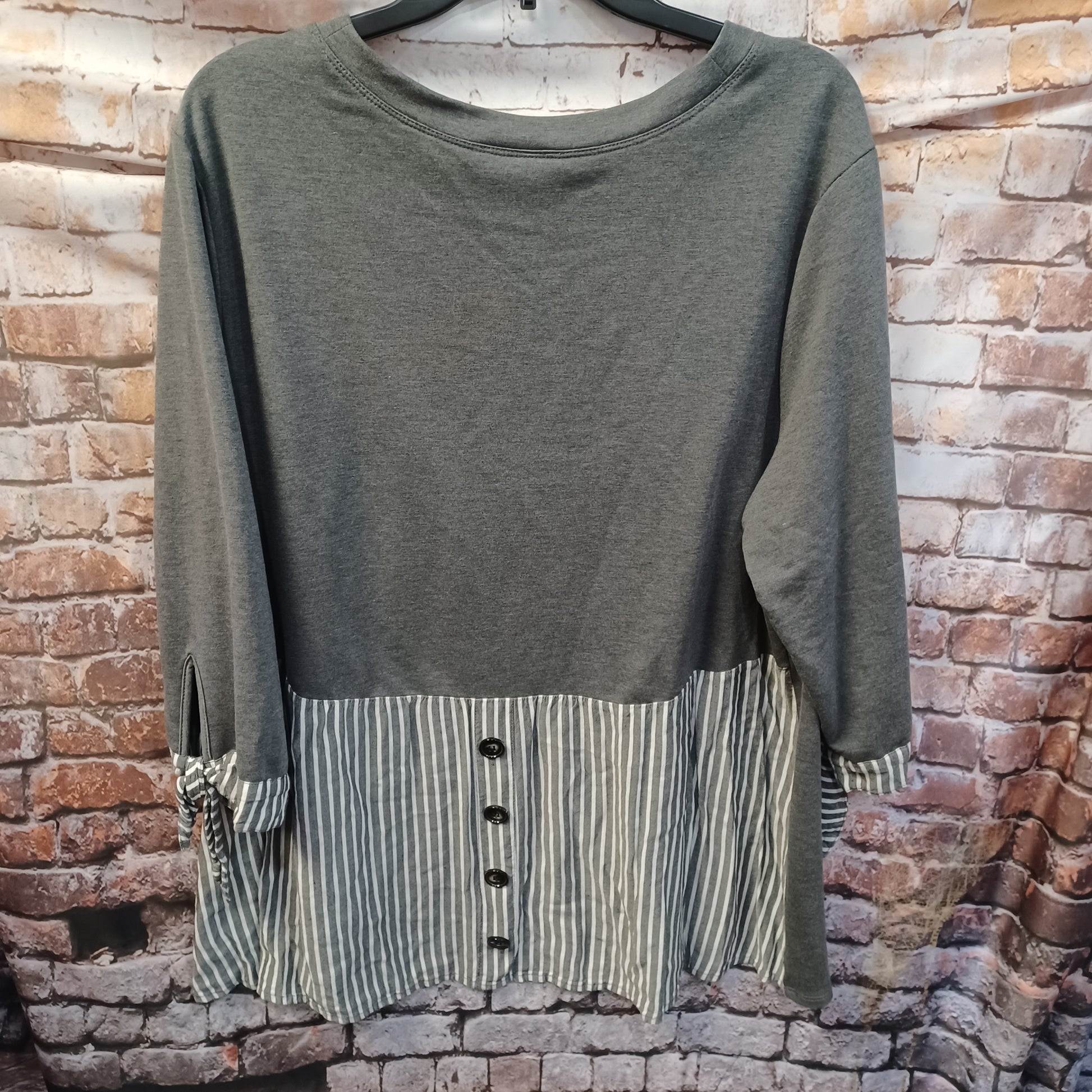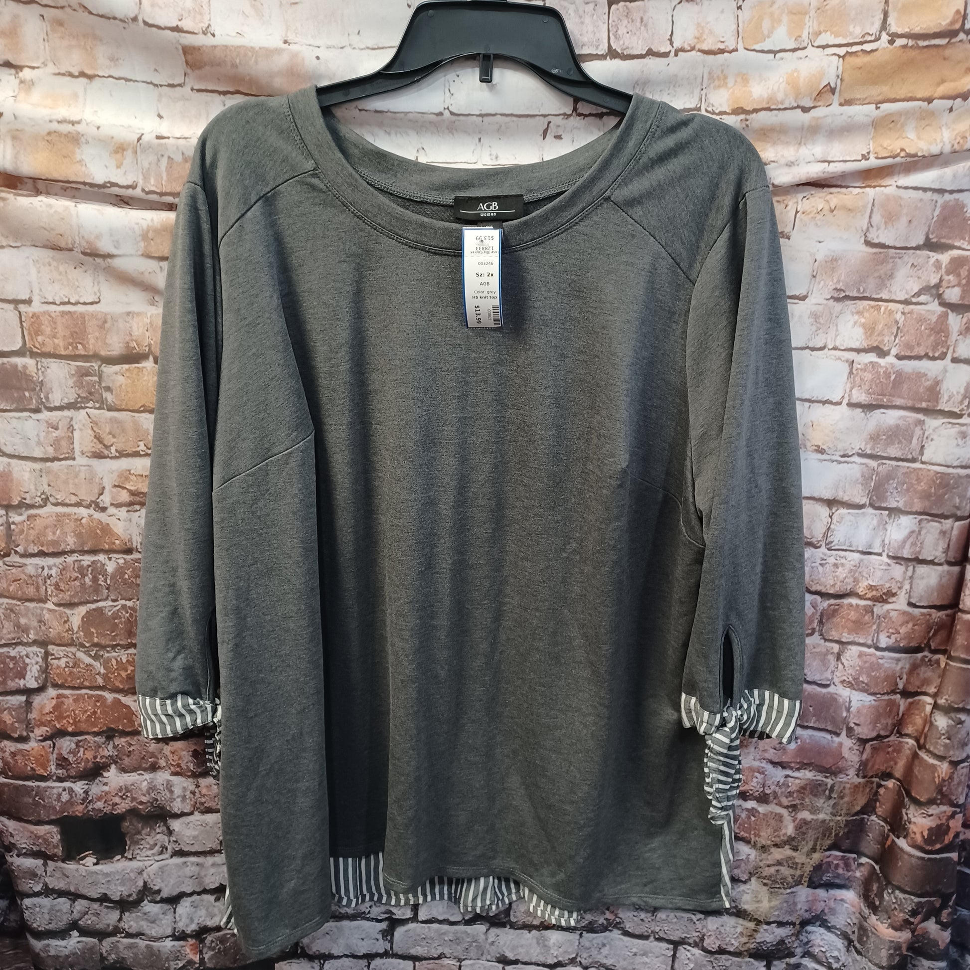 Super cute top in grey with sewn in cuffs and second layer in grey and white stripe.