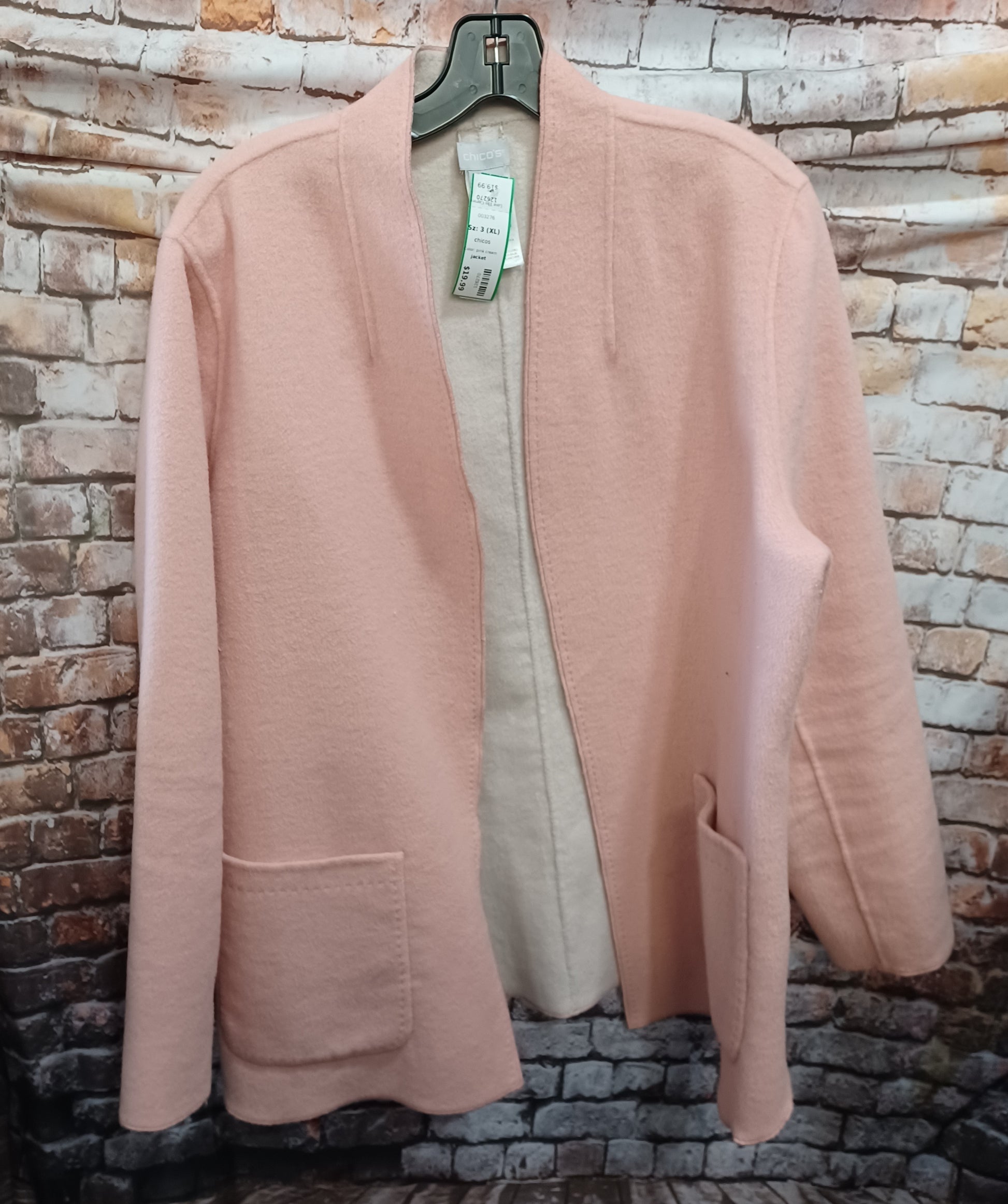 Fits a size XL. Long sleeve open front blazer style jacket in pink and white. It is reversible and a poly/wool blend. It is a gorgeous wardrobe staple piece.