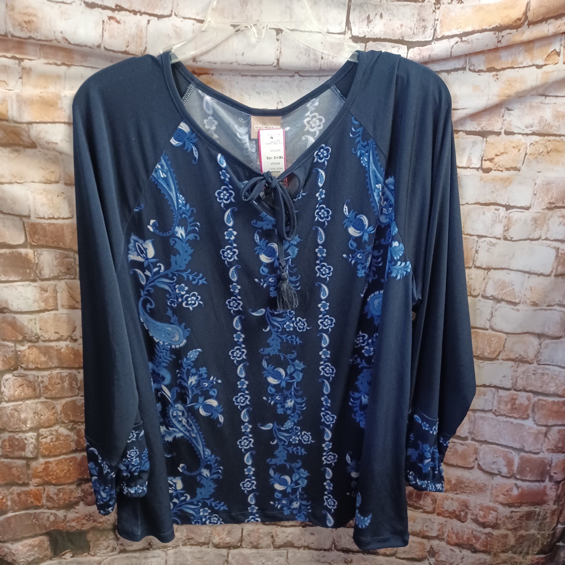 Fits a size 16/18. Three quarter sleeve blouse in navy with blue print. Boho chic
