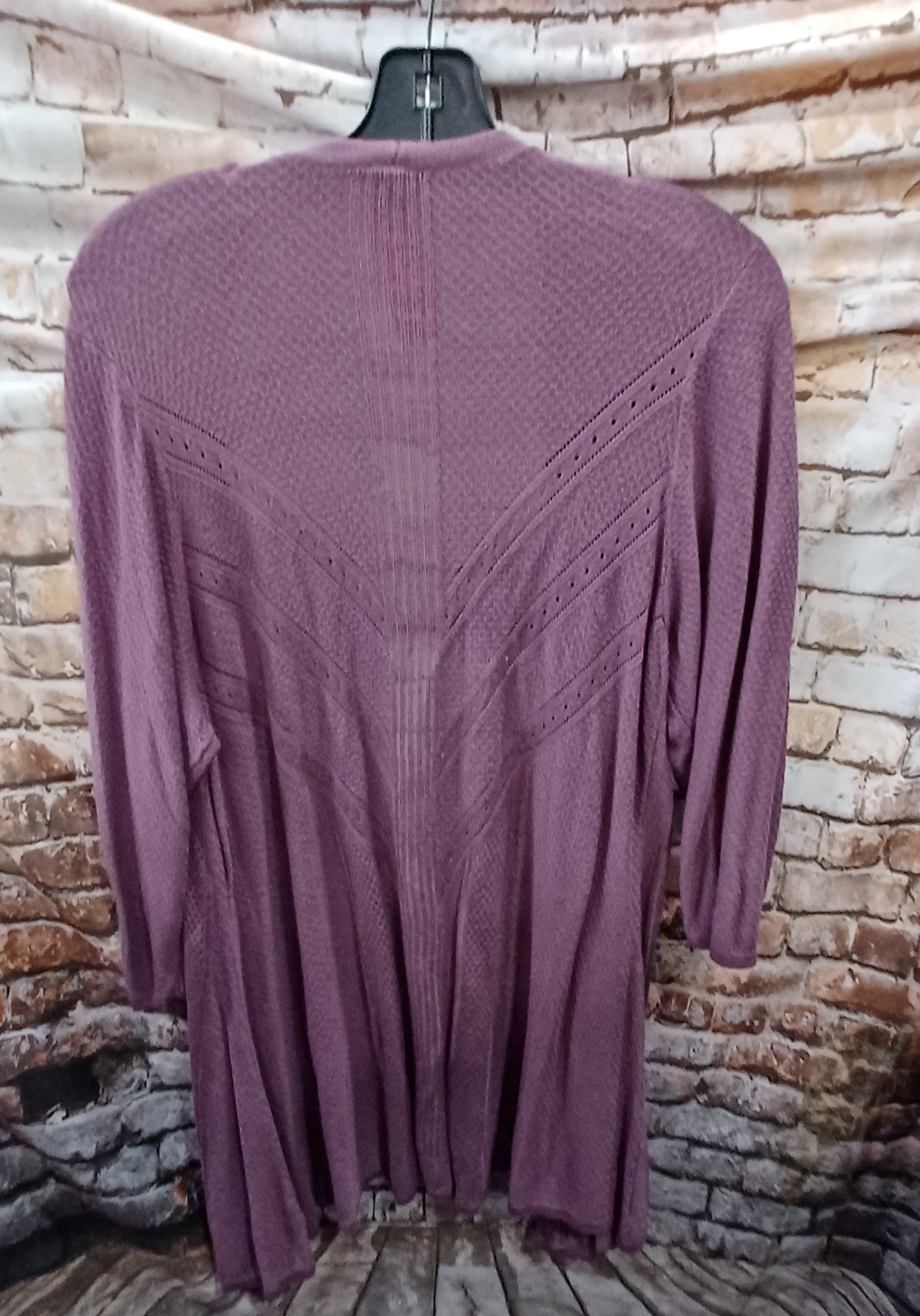 No close front medium length duster in purple. Lighter weight with long sleeves. Fits a size 22/24