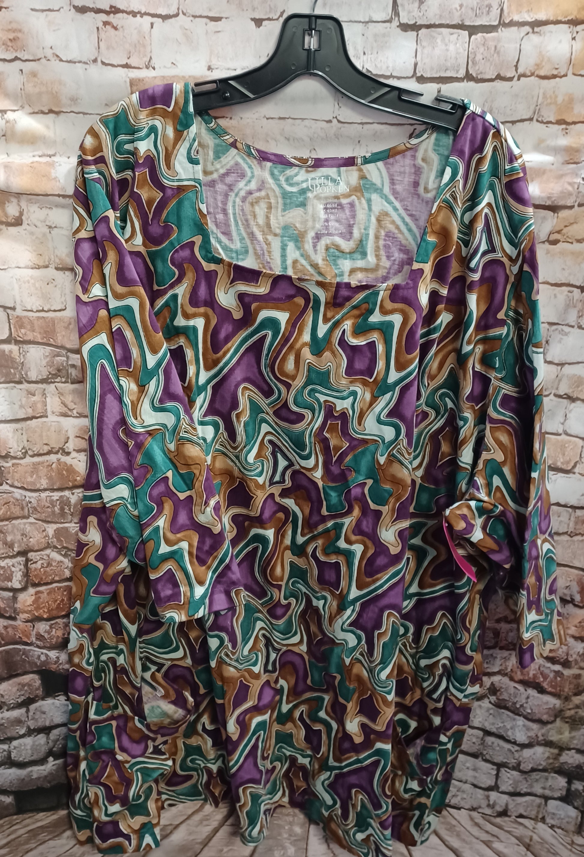 Half sleeve knit top in purple, teal brown and white print.