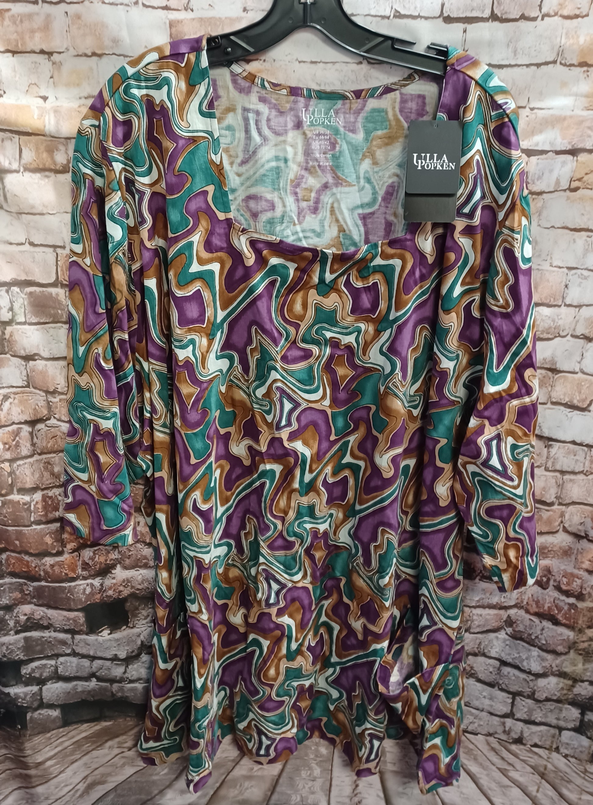 Brand new with tags, half sleeve knit top in brown, purple white and teal print.