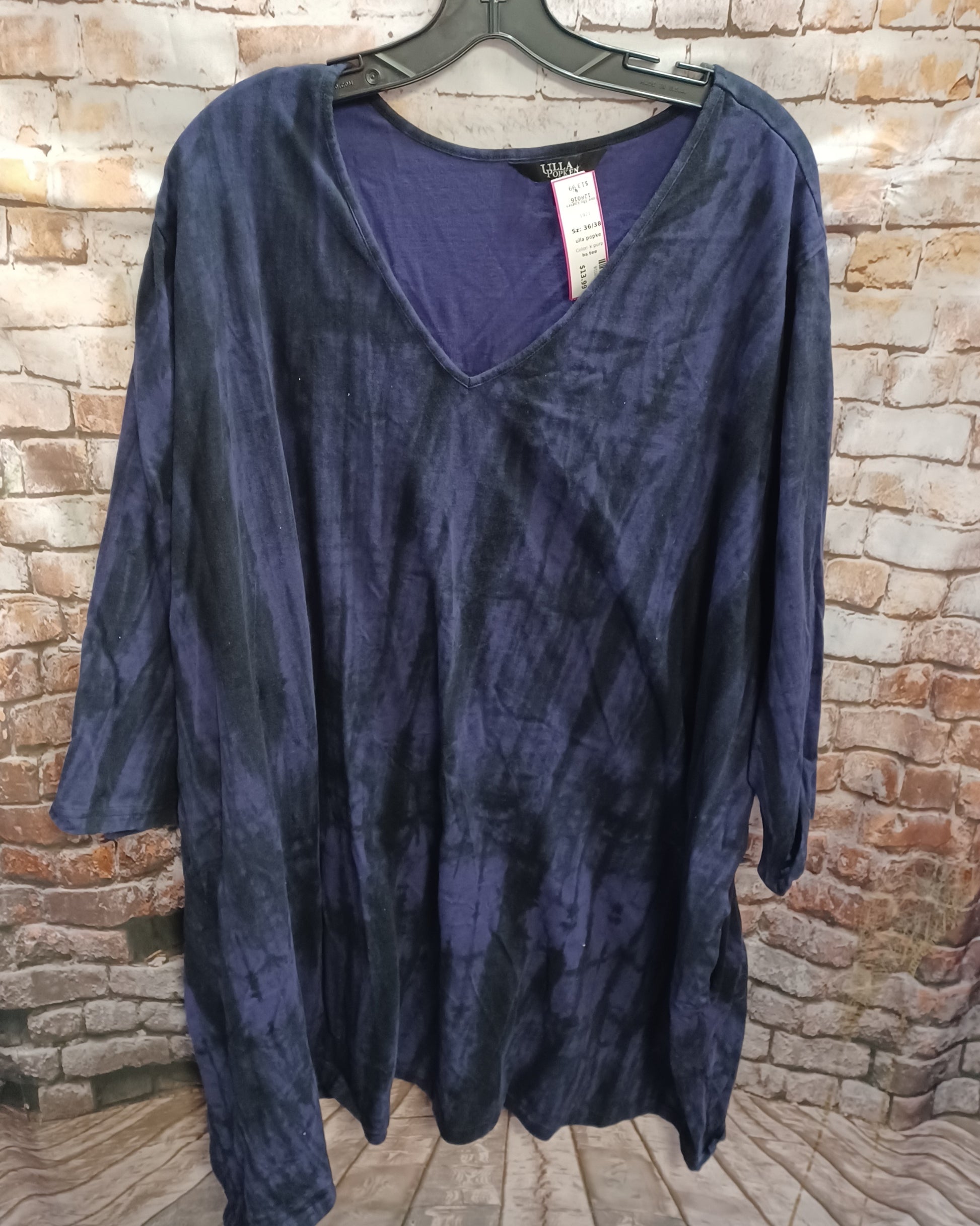 Half sleeve knit top in black and blue tie dye print.