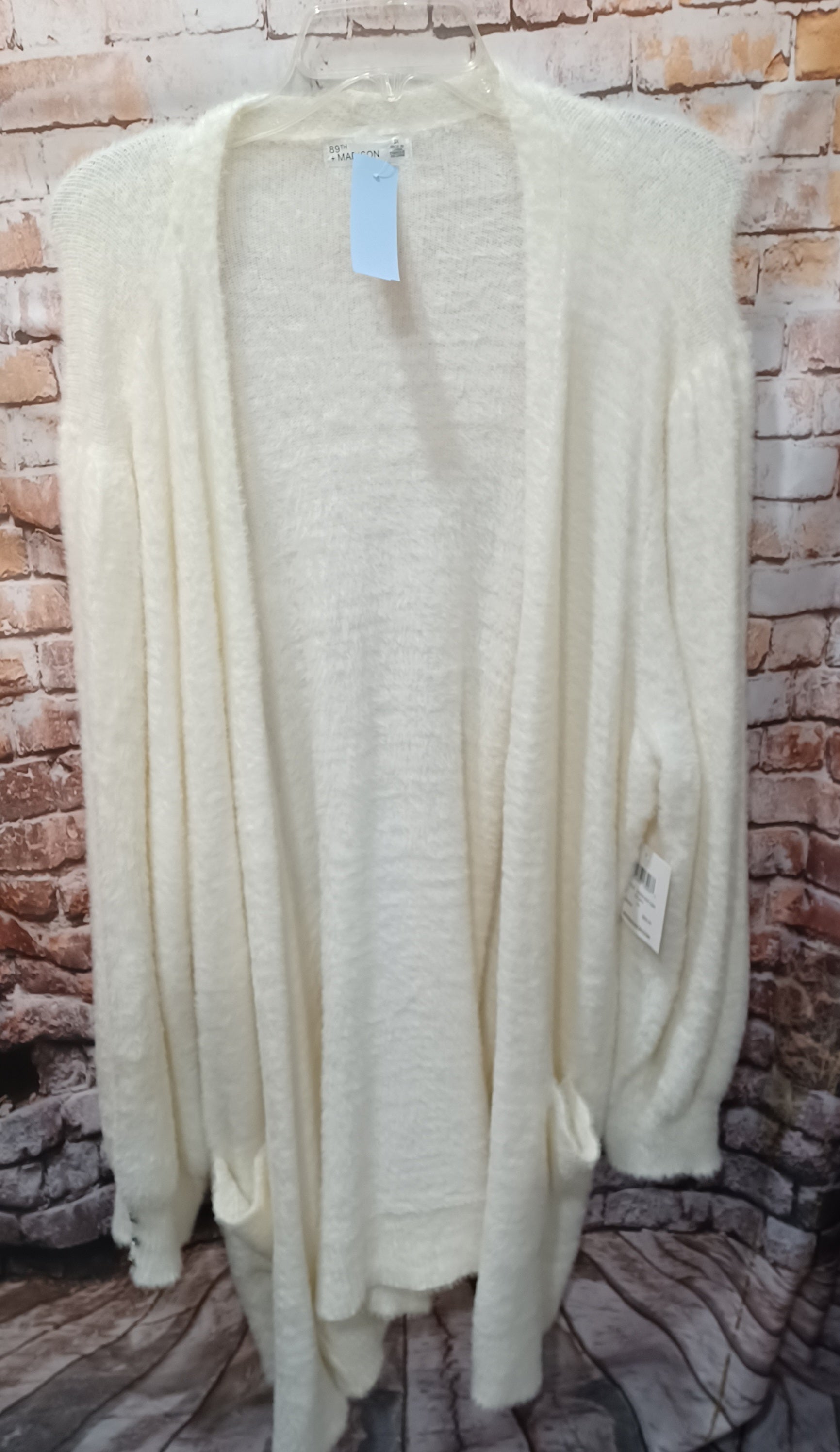 Brand new with tags. Medium length duster sweater in white that is SUPER SOFT! and fuzzy.