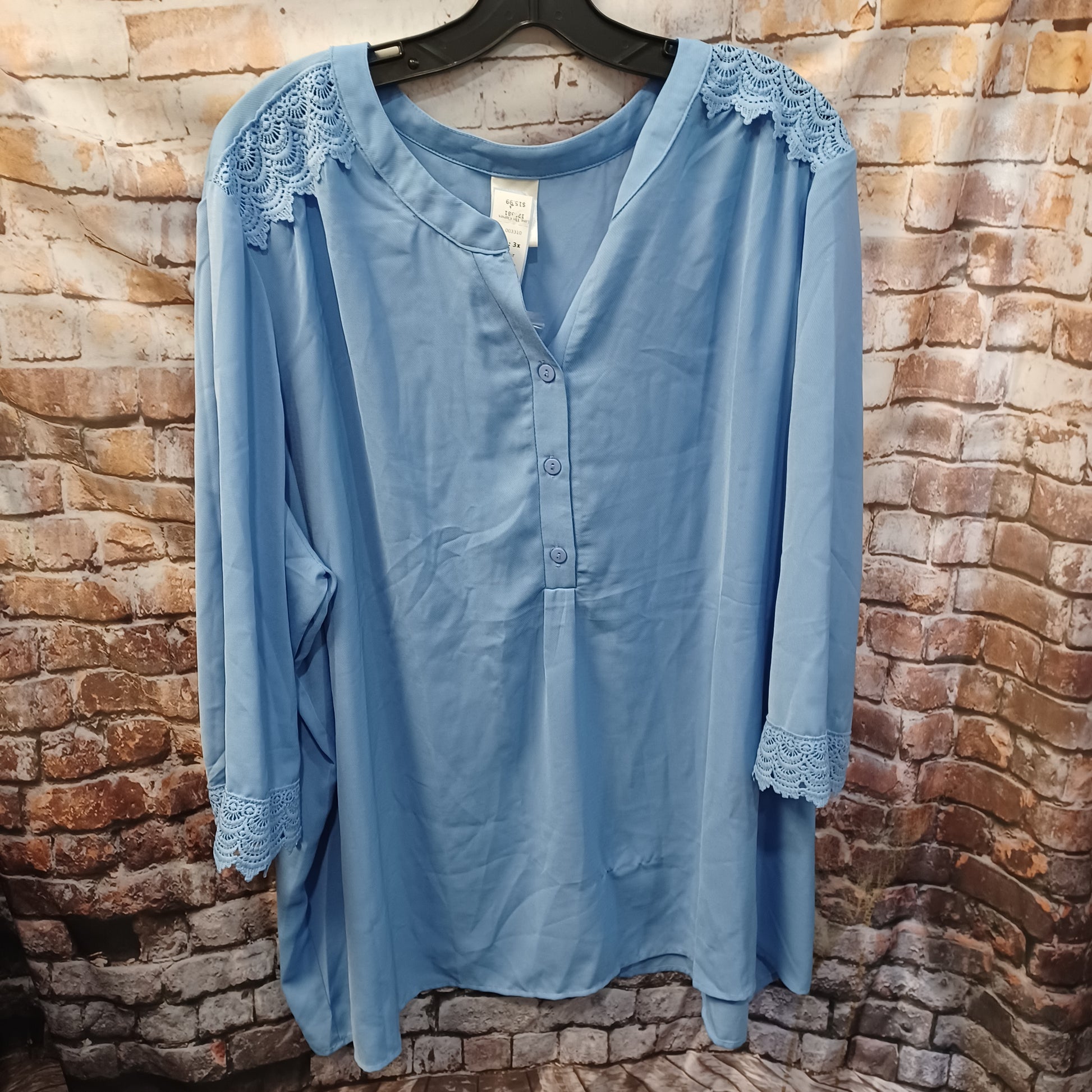 Brand new without the tags. Long sleeve baby blue blouse with lace on the cuffs and shoulders.