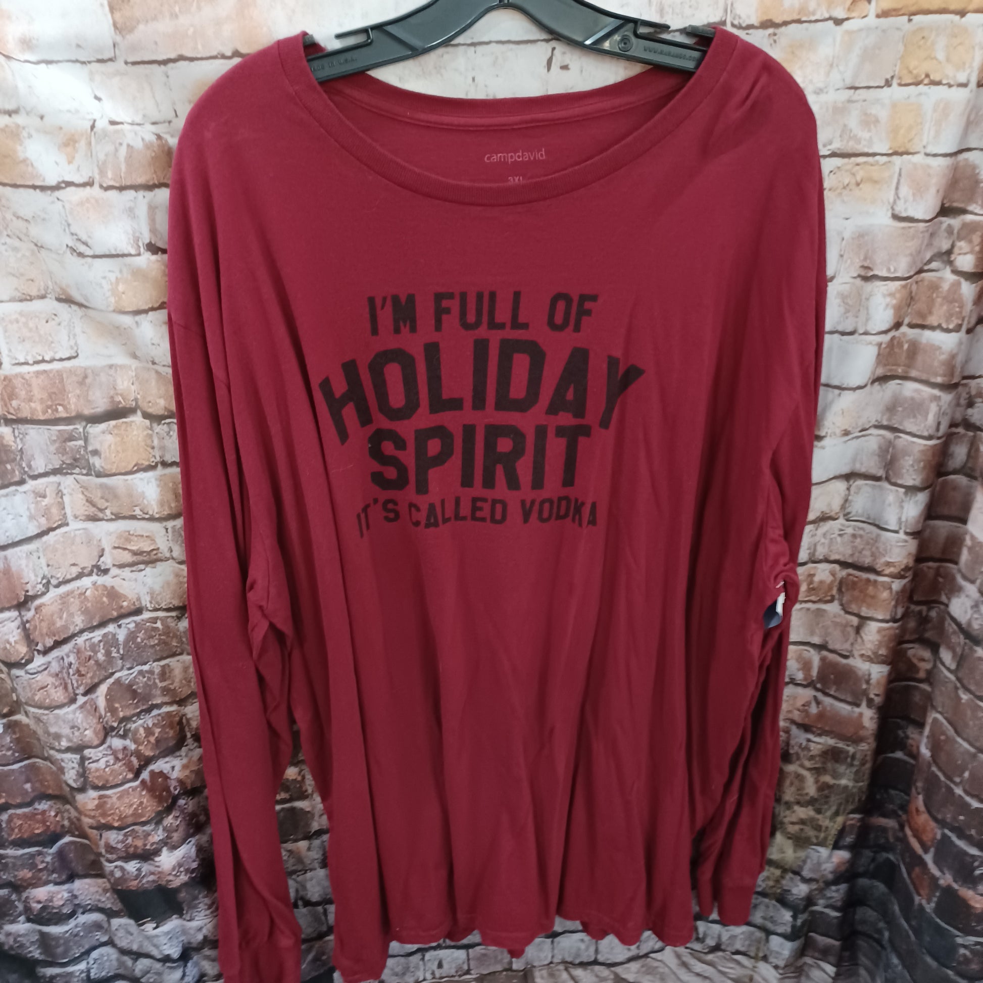 Long sleeve tee in burgundy with graphic or the holidays on the front. "full of holiday spirit. its called vodka."