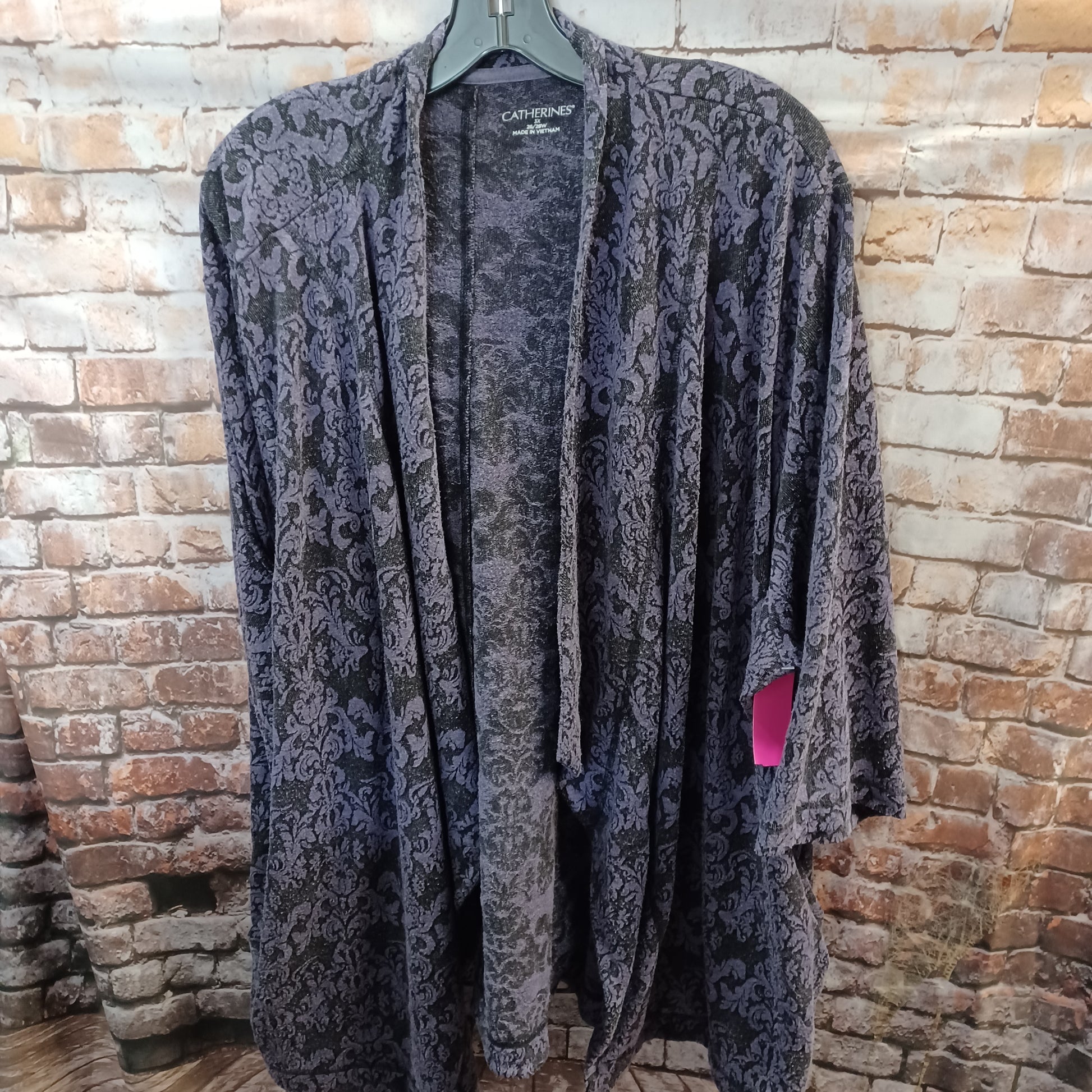 Half sleeve grey and purple knit cardigan style top with no close front.