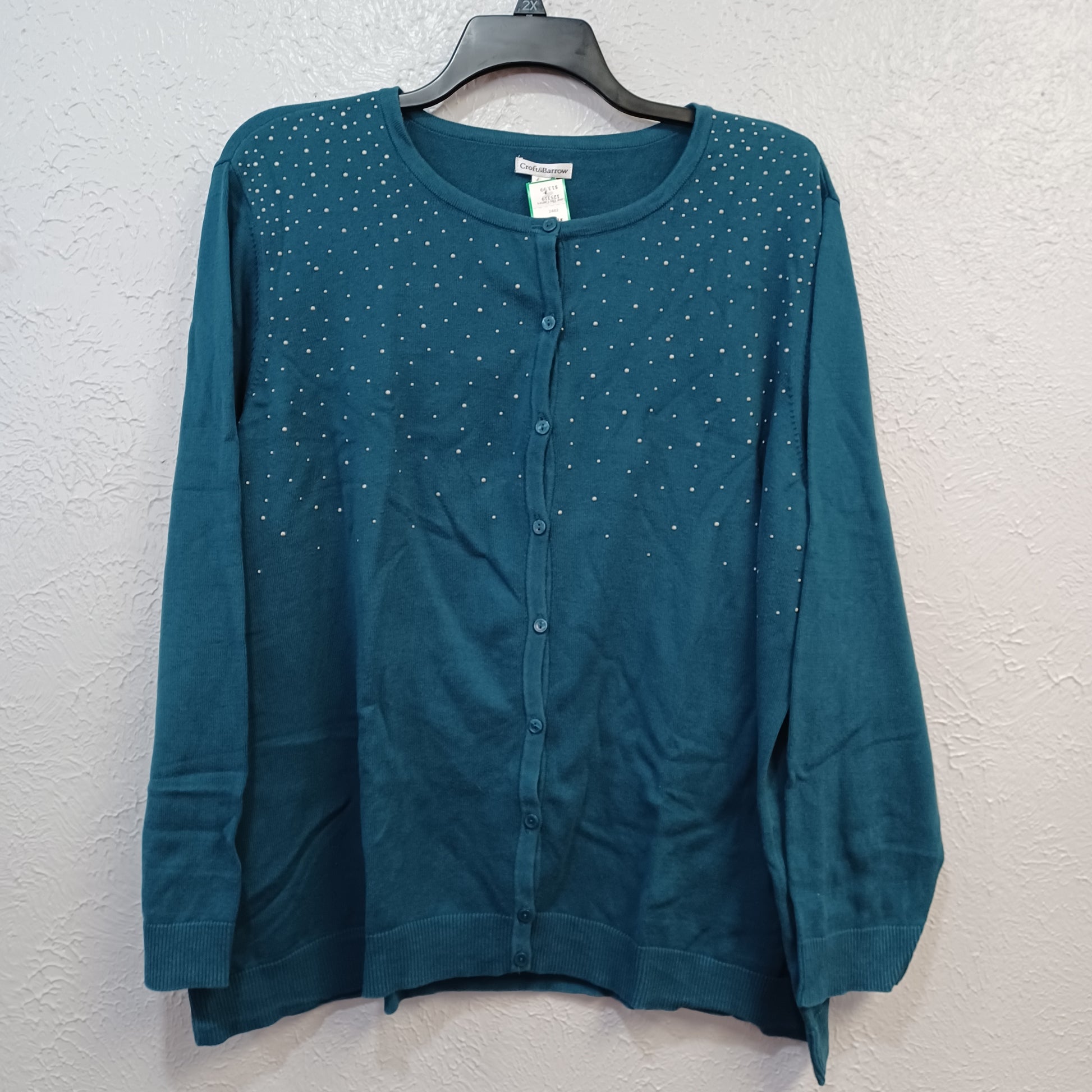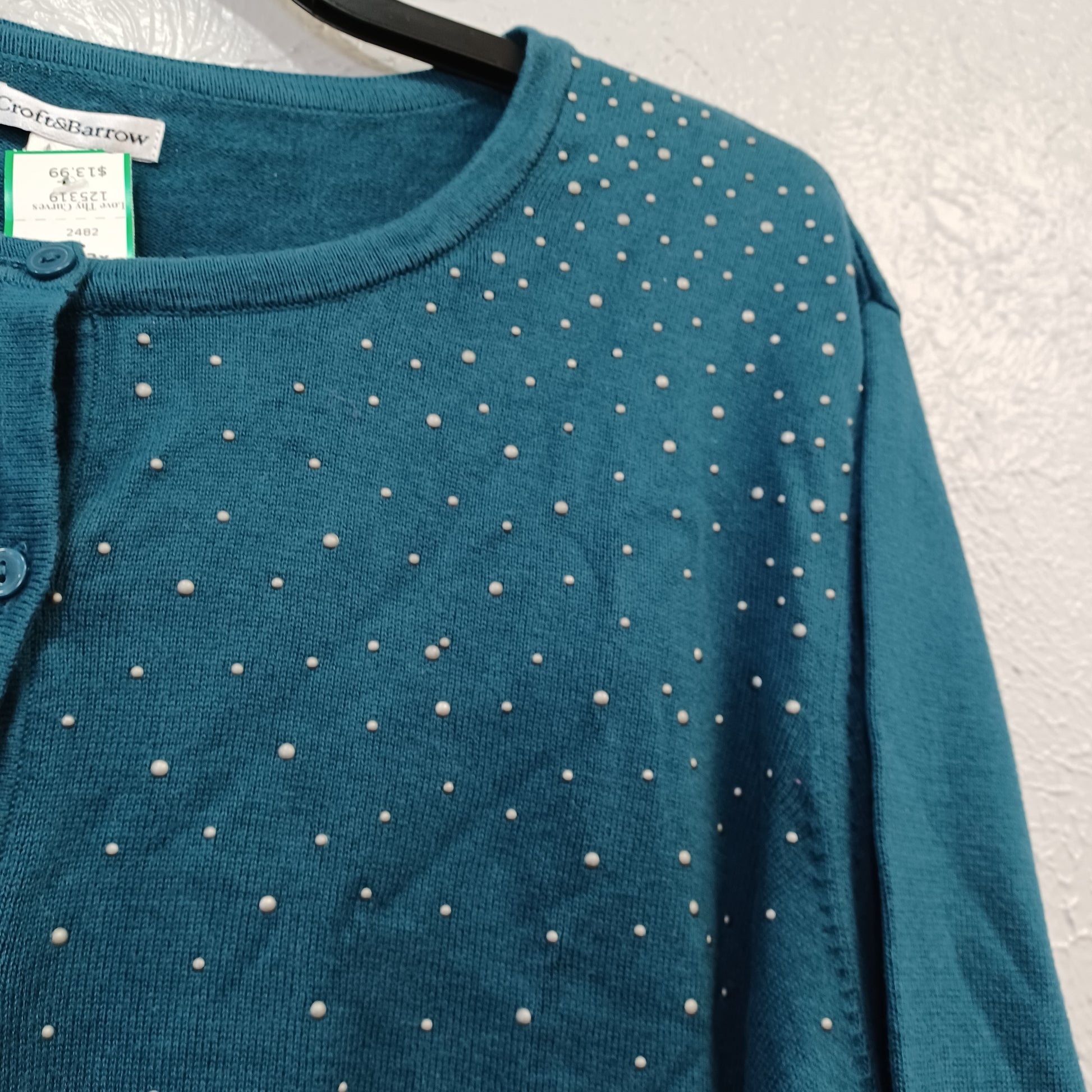 Long sleeve cardigan sweater in teal green with grey stud embellishments in the top chest and shoulders for added flair.