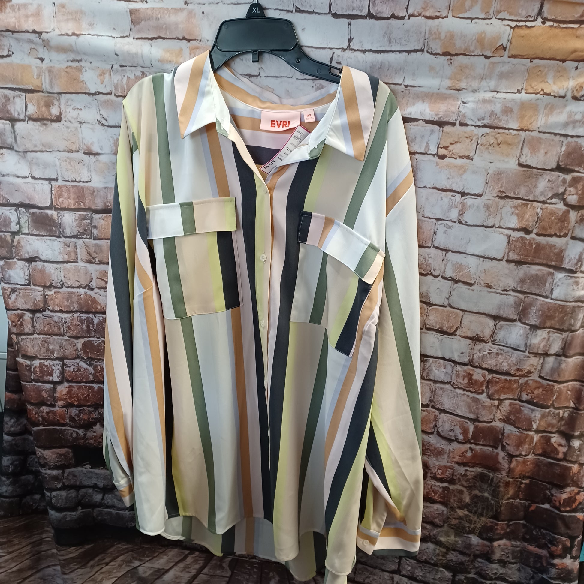 Love this brand new with tags blouse with button up front. Done in a multi colored stripe it can be used for many occasions in multiple seasons.