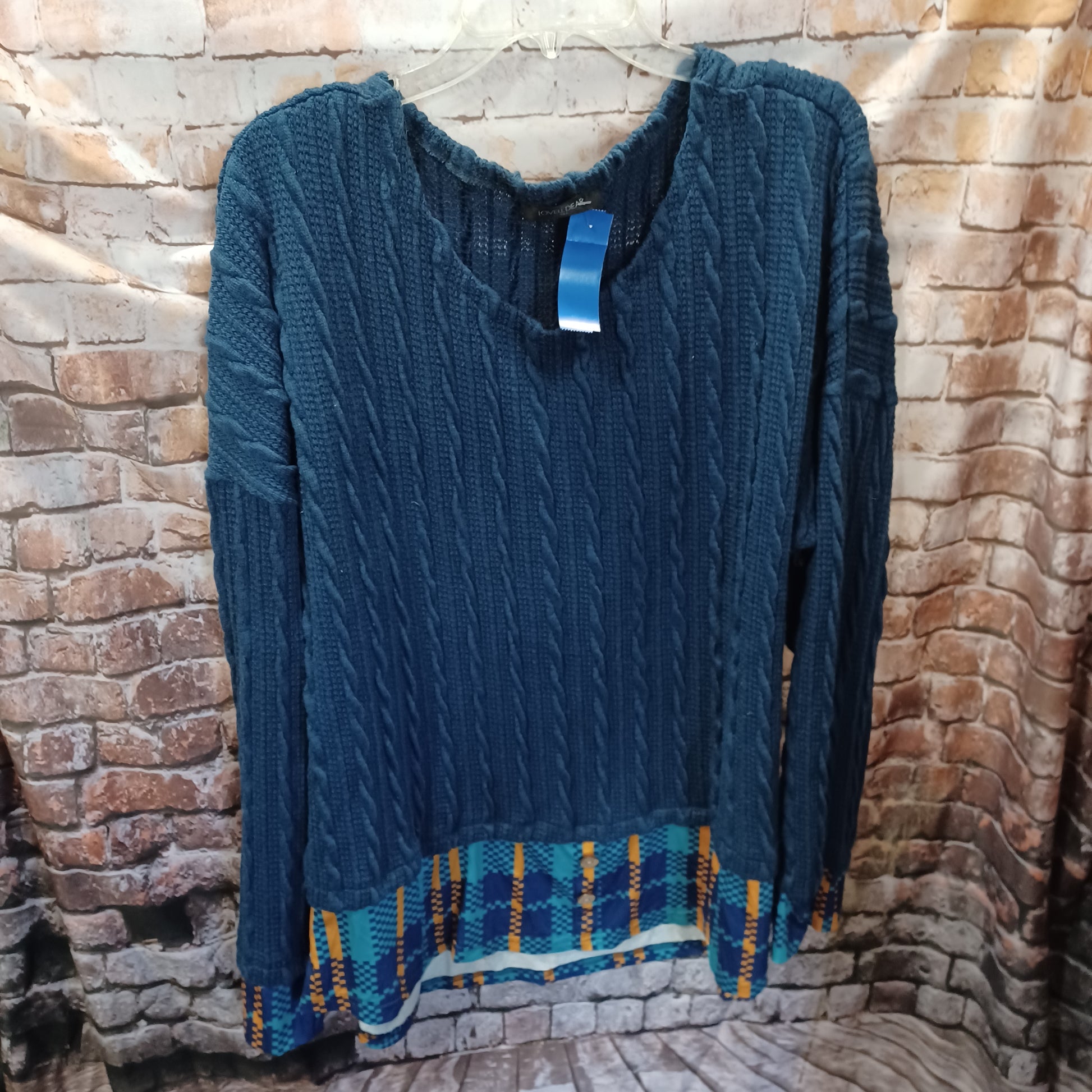 Long sleeve blue sweater with sewn in faux second layer on the cuffs and hemline.