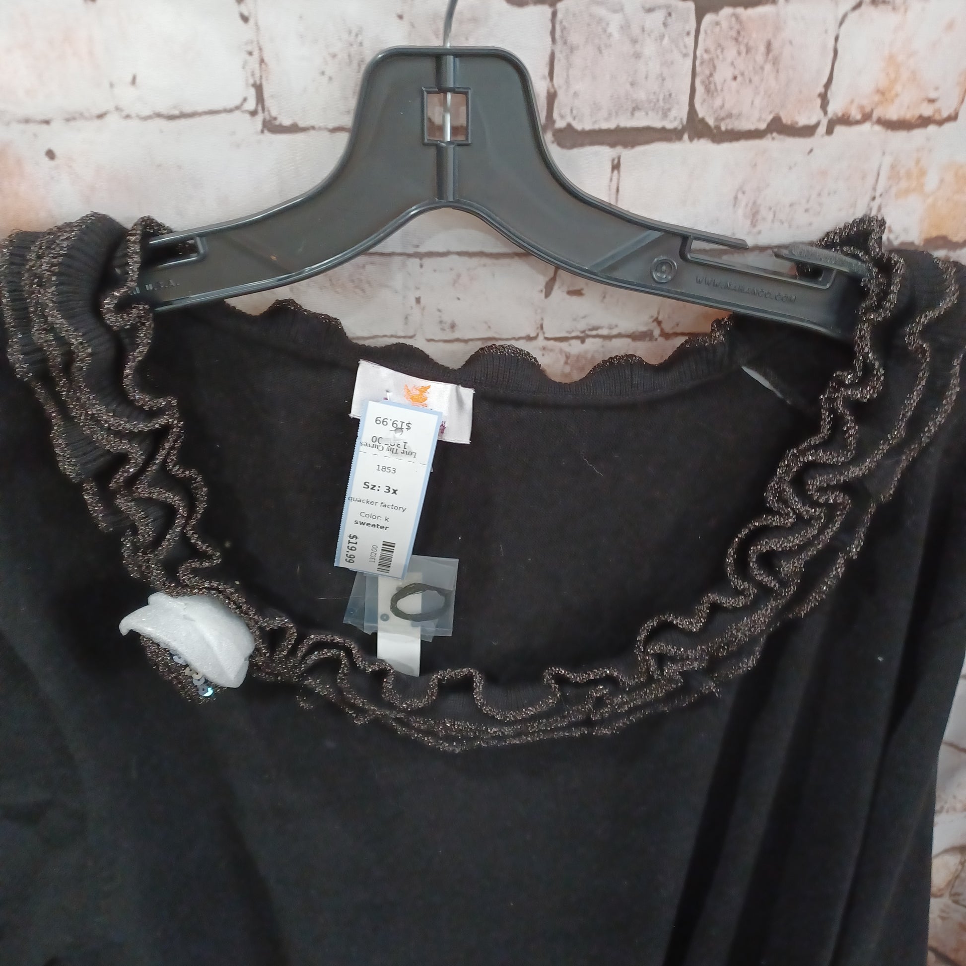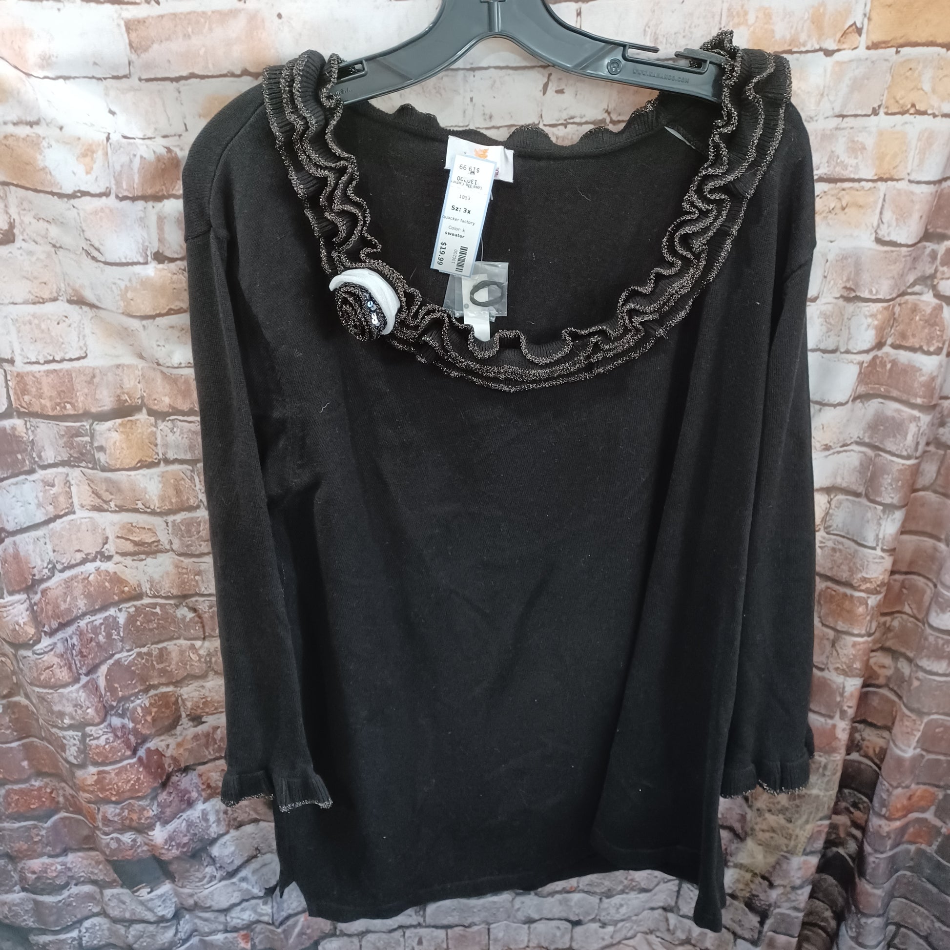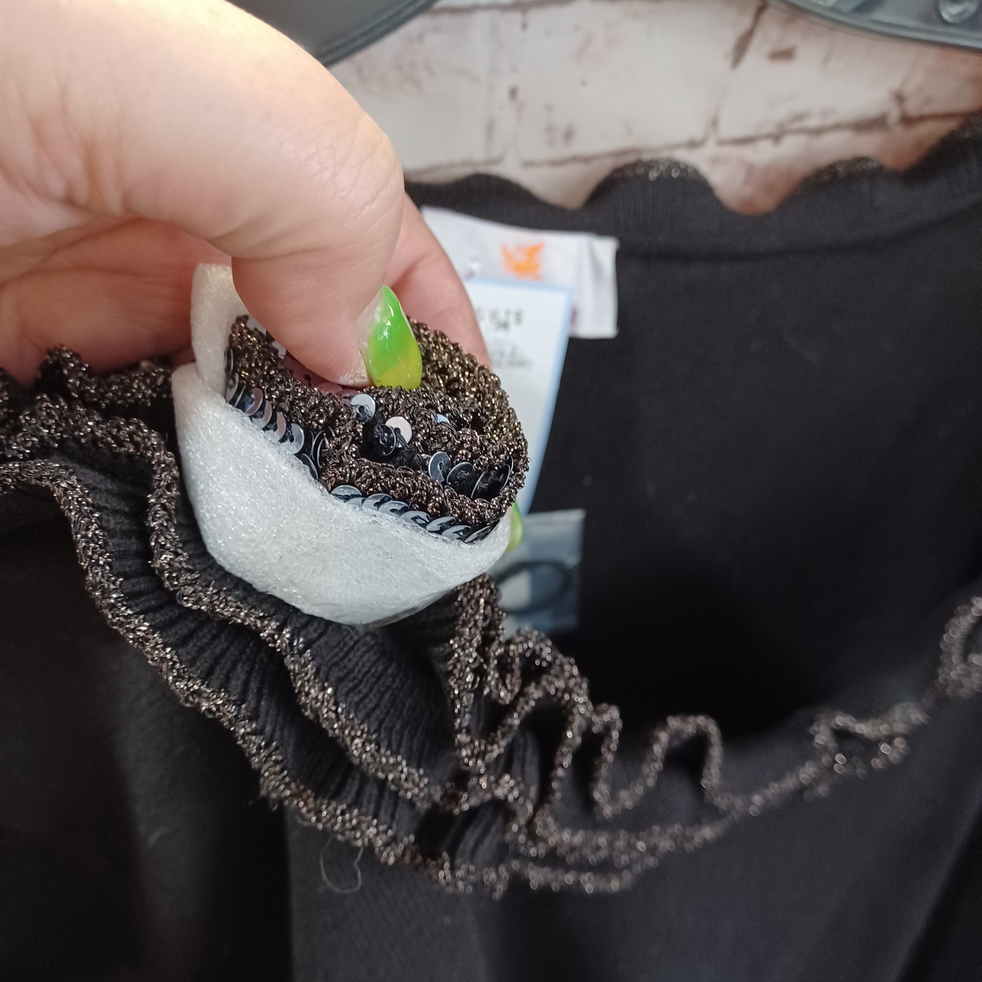 Brand new with tags. Even has the shipping material around the rosette on the collar. Three quarter sleeve black sweater with silver edged cuffs and ruffled collar.
