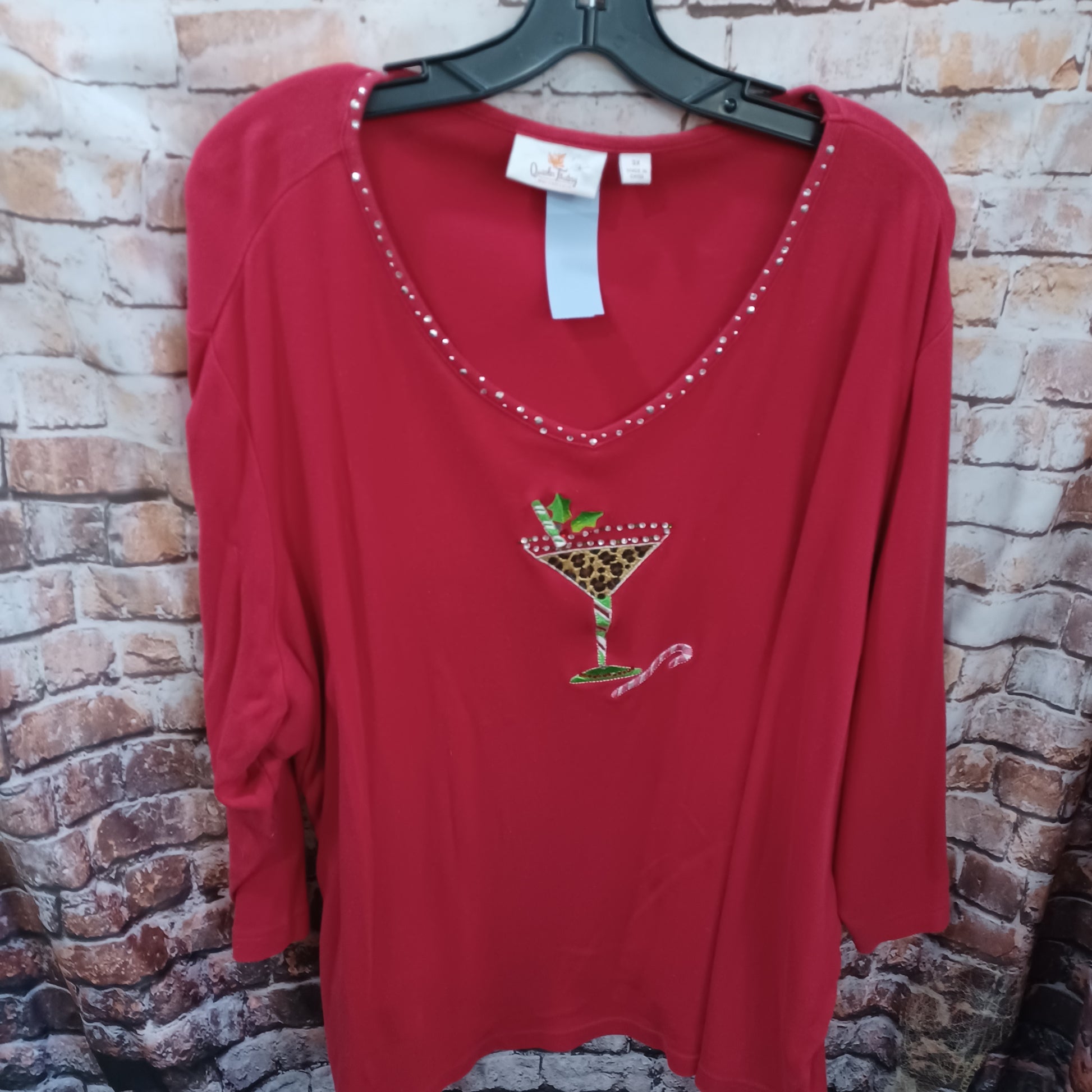Long sleeve red knit top with a martini style Christmas embroidered on the front.