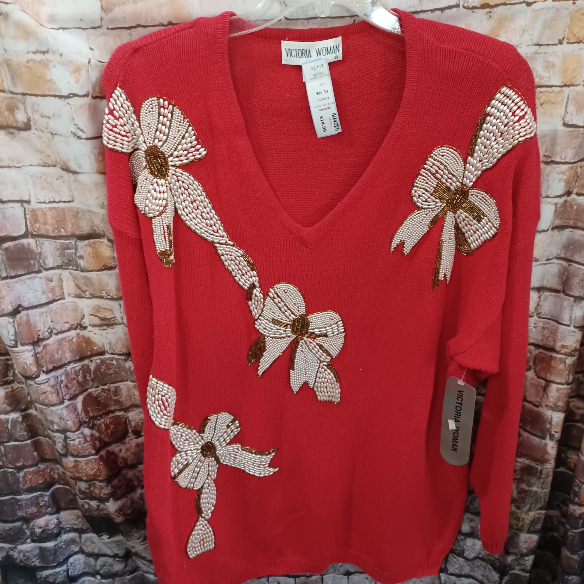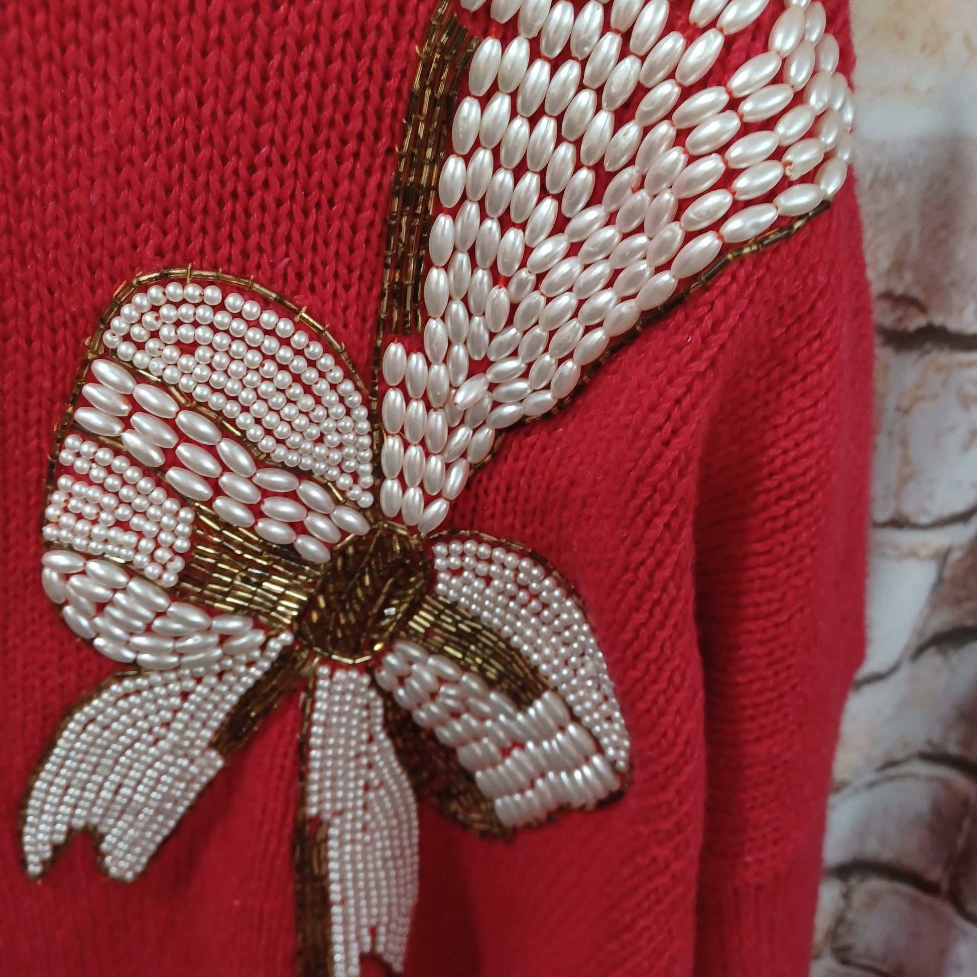Oh the vintage joy of this brand new with tags sweater! Long sleeve and red with beaded gold and white bows. Perfect for that holiday party.