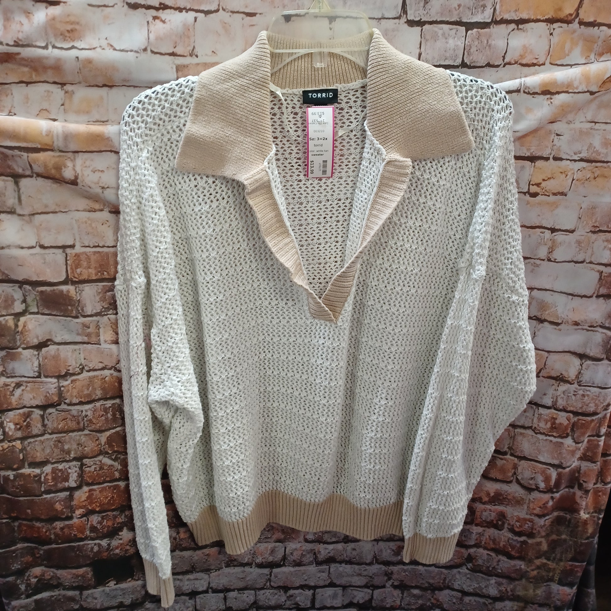 Fits a size 26. Long sleeve white sweater with tan color and cuffs. Larger knit so will need something underneath....... or not... we do not judge ;)