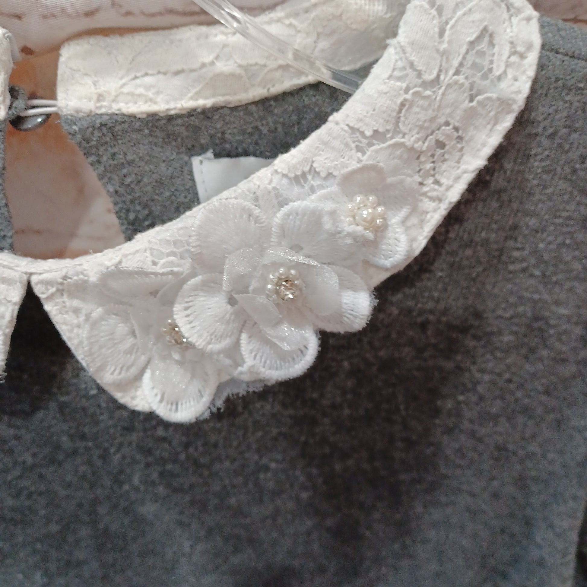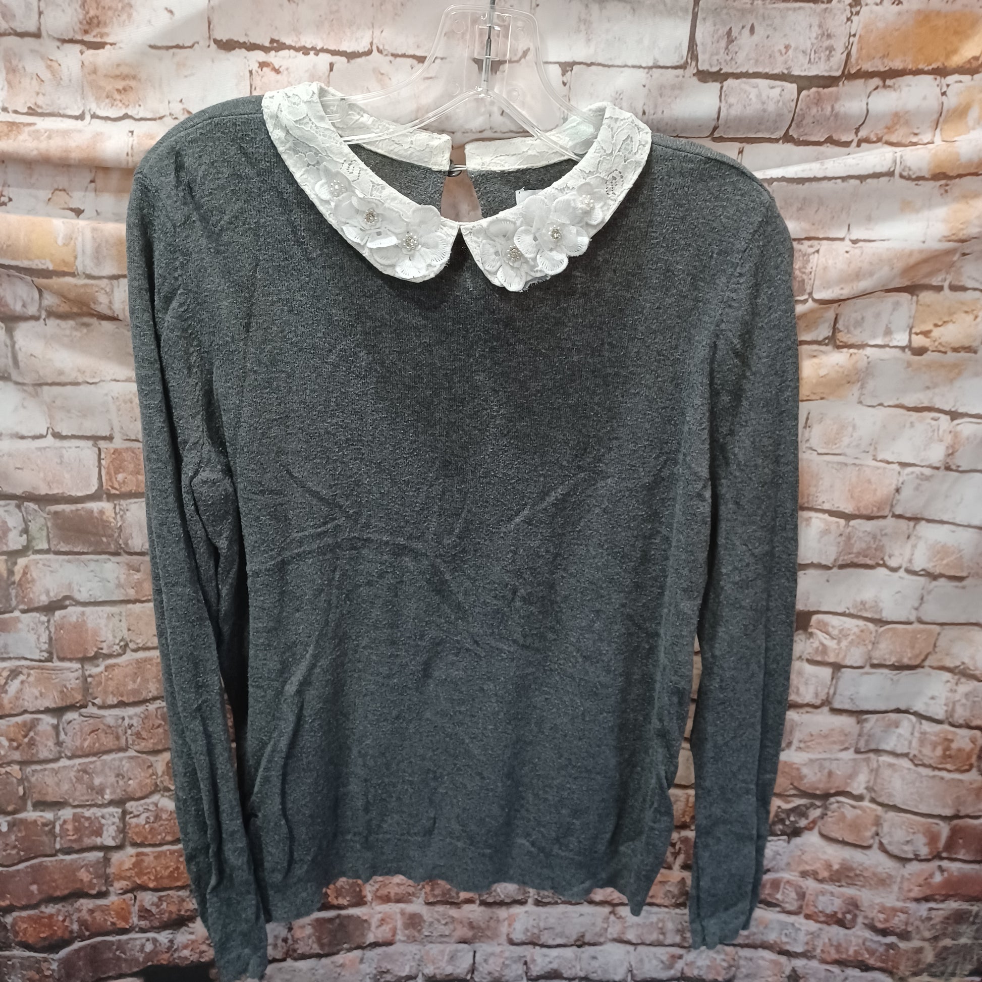 Long sleeve lightweight sweater in grey with white lace collar and floral and bling adornments.
