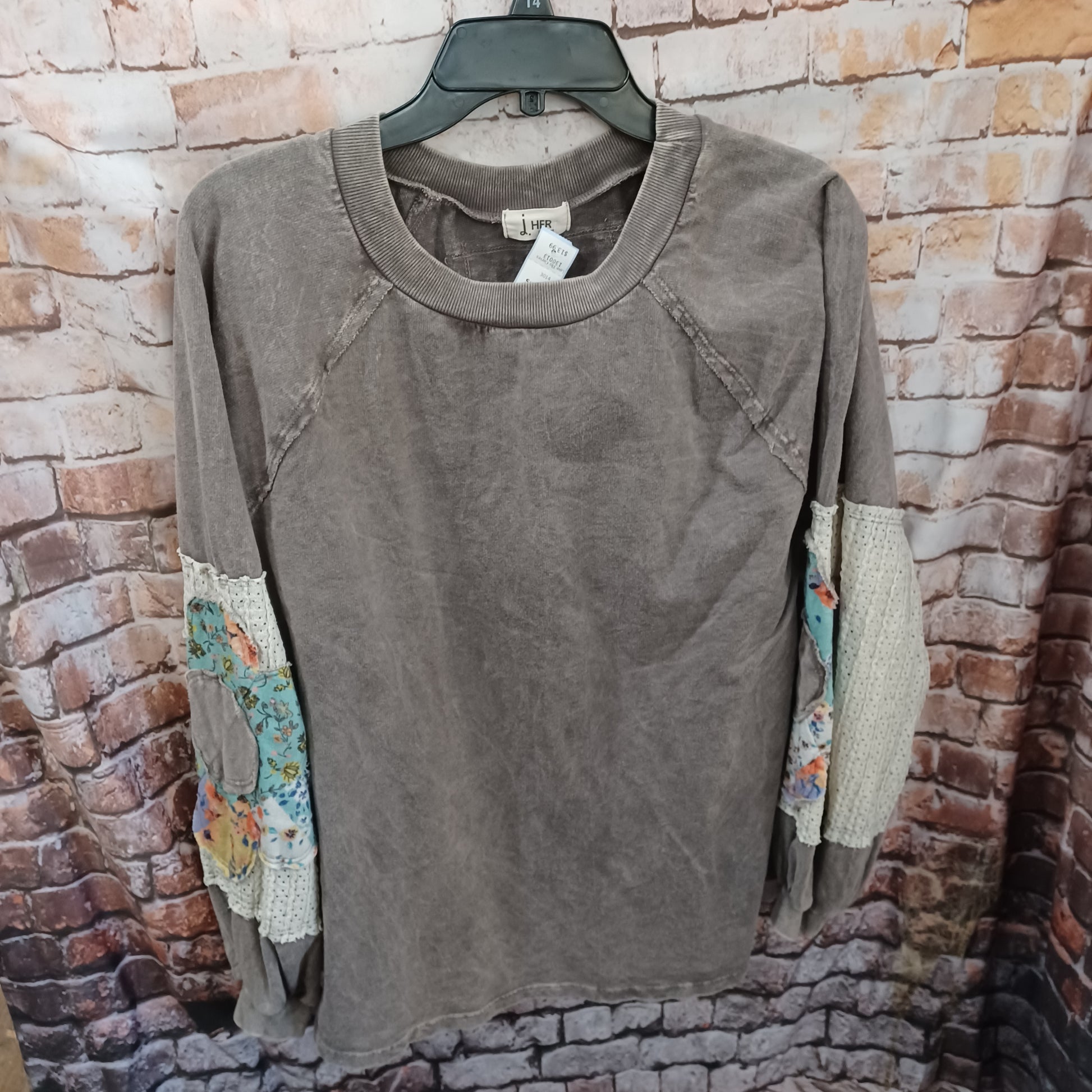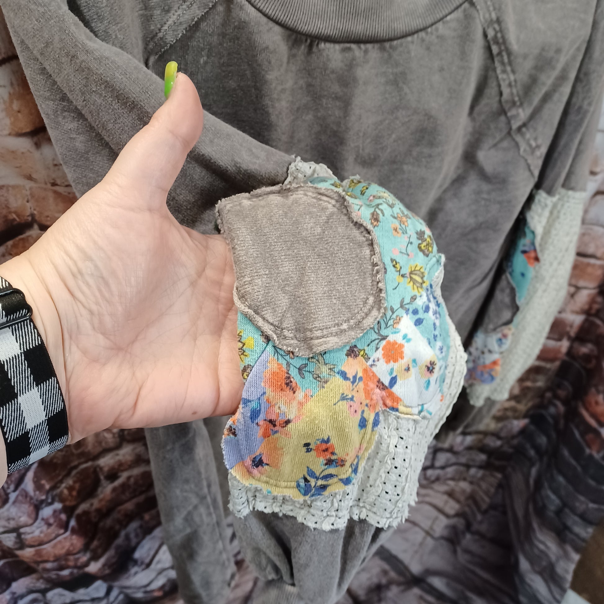 Long sleeve boho style top in grey with multi colored patches on the sleeves
