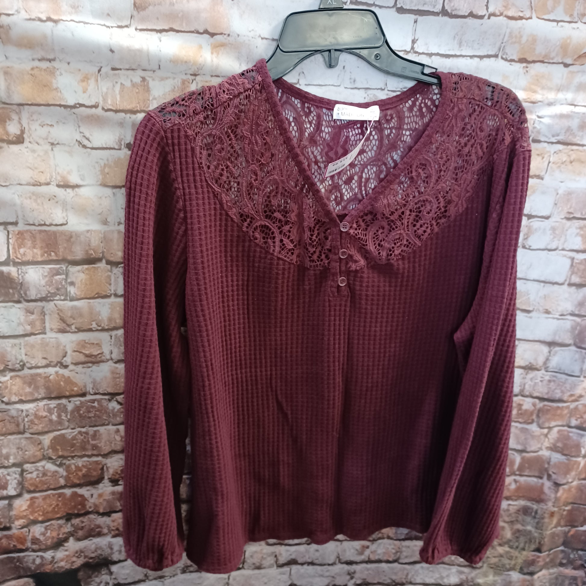 Long sleeve thermal style top in burgundy with beautiful lace design on the chest and shoulders.