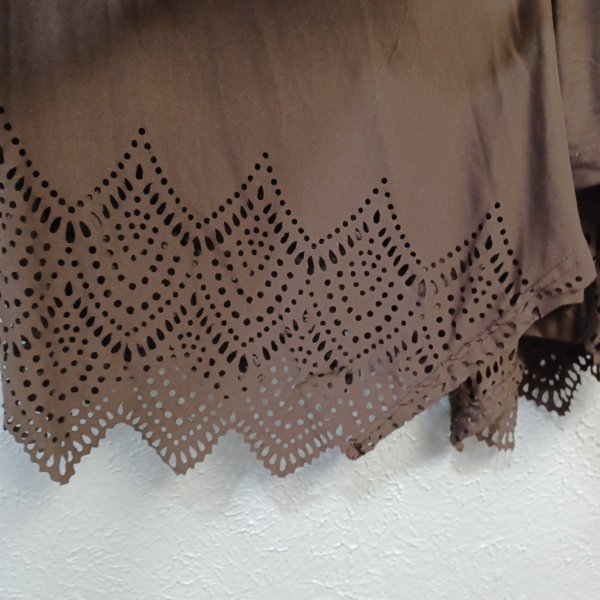 Knit cardigan in brown with country style vibes. Die Cut design on the bottom all the way around and no close front with long sleeves. Great fall piece!