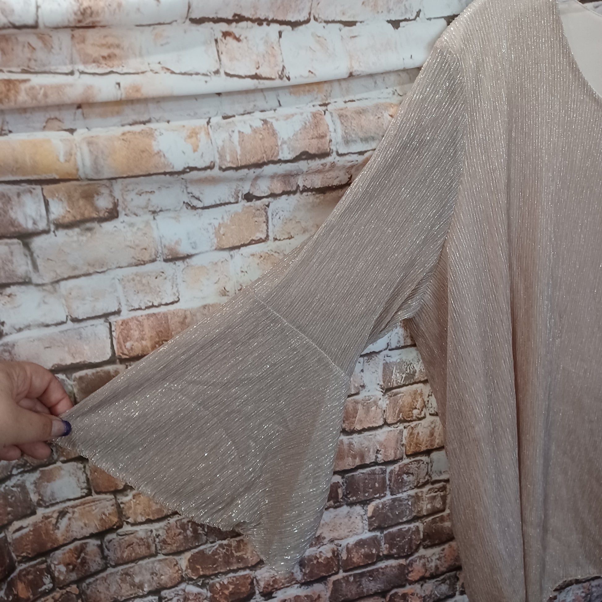 Blouse with half sleeves in a soft pink with silver threading for shimmer and flair.